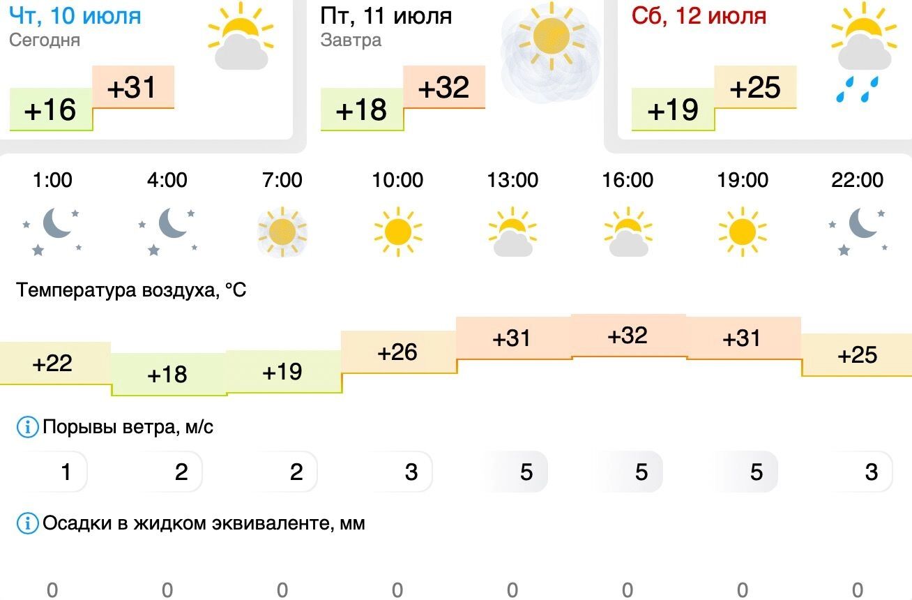 Данные сервиса Gismeteo указывают, что ночь также будет теплой — +18…+19 °C. К утру воздух прогреется до +26 °C, а к обеду температура поднимется до +31 °C. Максимальный тепловой пик придётся на примерно 16:00 — тогда ожидается до +32 °C. К вечеру, около 22:00, температура снизится до +25 °C.