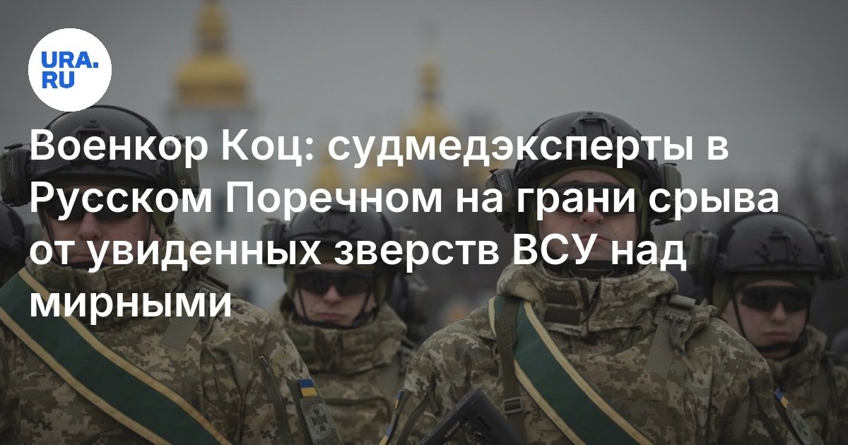 Военкор привел слова исполняющего обязанности начальника курского Бюро судебно-медицинской экспертизы Татьяны Балеевских, которая «старается держаться перед камерой». Судмедэксперт рассказала о жертвах расправы ВСУ в Русском Поречном. Некоторые мужчины и женщины избиты — у них переломаны ребра, кисти рук, выбиты колени. На одной из убитых женщин нашли следы воздействия электрического тока. Многие из этих сельских мирных жителей были расстреляны в упор, в грудь или спину. Некоторых закидывали гранатами.