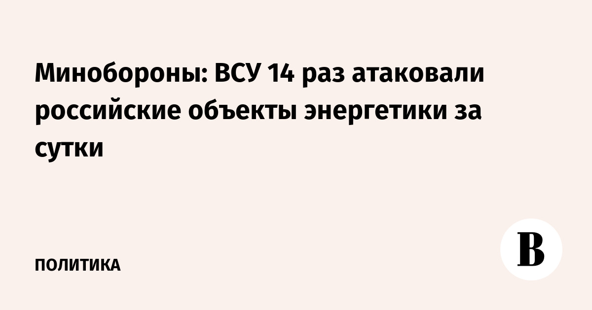 Вооруженные силы Украины (ВСУ) за сутки 14 раз атаковали российскую энергетическую инфраструктуру. Об этом сообщило Минобороны РФ в Telegram-канале.