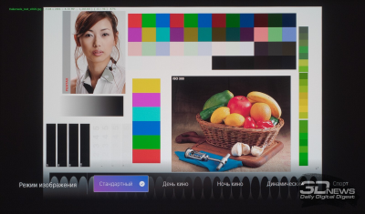 Меж тем мы бы воздержались от использования таких режимов, как «Спорт» и «Динамический». В них изображение теряет детали как в светах, так и немного в тенях. Точка белого завалена в холодные оттенки, баланс серого «мечтает» вернуться в норму, но у него это не получается, а резкость крайне завышена.