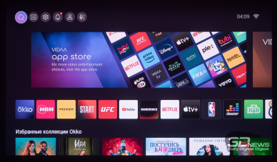 Заглавная страница интерфейса VIDAA U6 выглядит классическим для многих устройств подобного рода образом. Это типичная плиточная структура с широкими эффектными баннерами/предложениями/рекламой. Прокручивая рабочий стол вниз, вы будете наблюдать рекомендуемый для просмотра контент от всех предустановленных сервисов, в том числе тех, в которых вы ещё не прошли регистрацию/в которые не зашли под своим аккаунтом.
