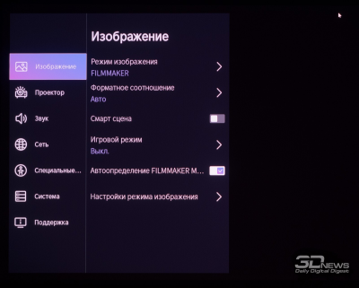 Никуда не делся и специальный предустановленный режим изображения Filmmaker, позволяющий приблизиться к той картинке, которую задумывал режиссёр фильма, без надуманных электроникой приукрашиваний. Режим особенный, поэтому производитель оставляет пользователю только возможность регулировки яркости источника лазерного света, а все остальные параметры блокируются.