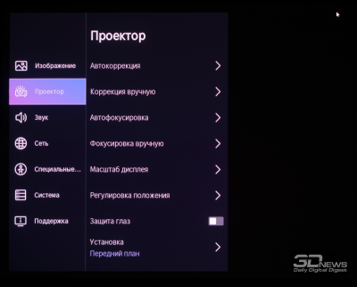 Ну и наконец, если у вас есть какие-либо претензии к проецируемой картинке с использованием какого-либо из источников сигнала, то в меню Laser Mini Projector C1 имеются все необходимые параметры для избавления от практически любых огрехов отображения.