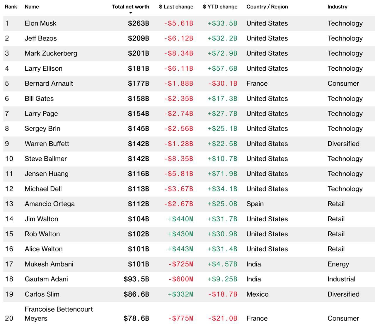 На первом месте - Илон Маск. Его состояние оценивается в 263 млрд долл., за год он заработал 33,5 млрд.