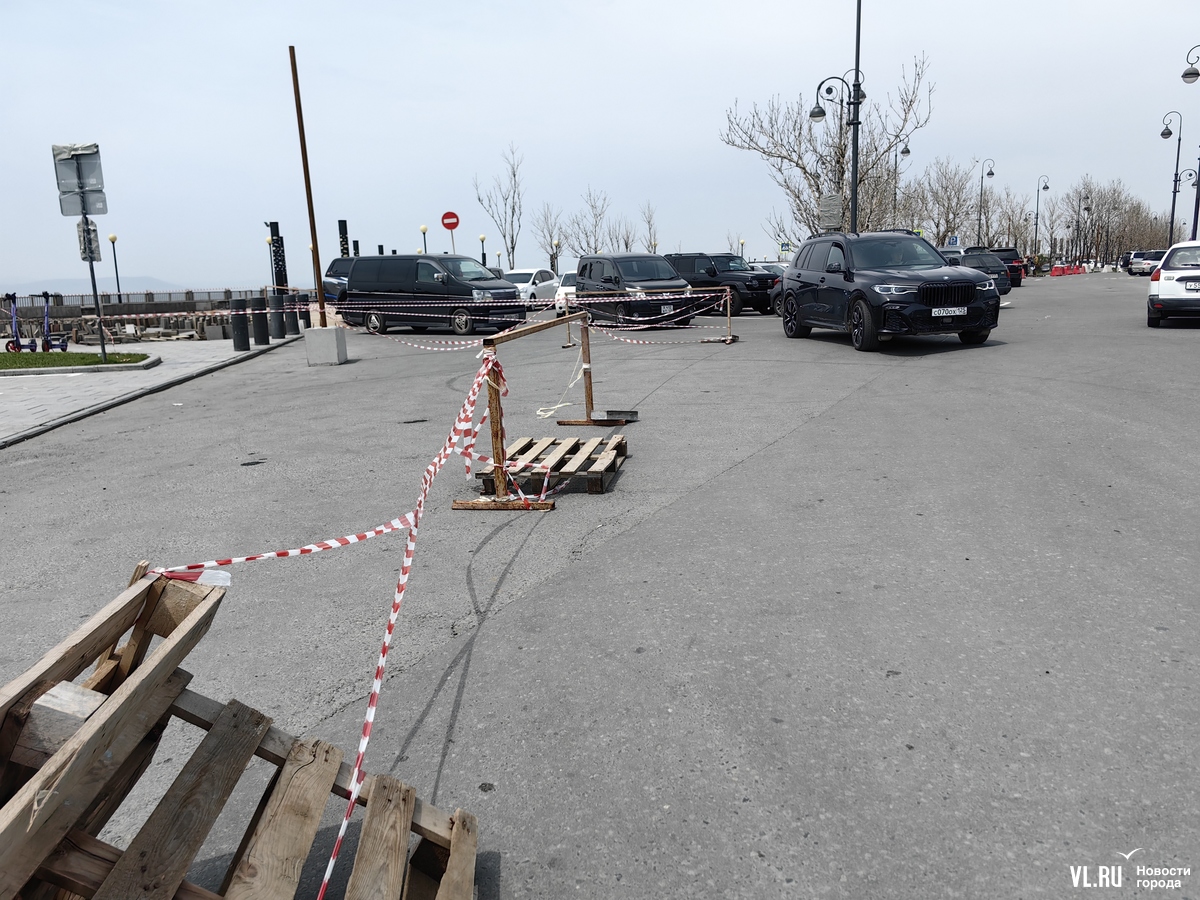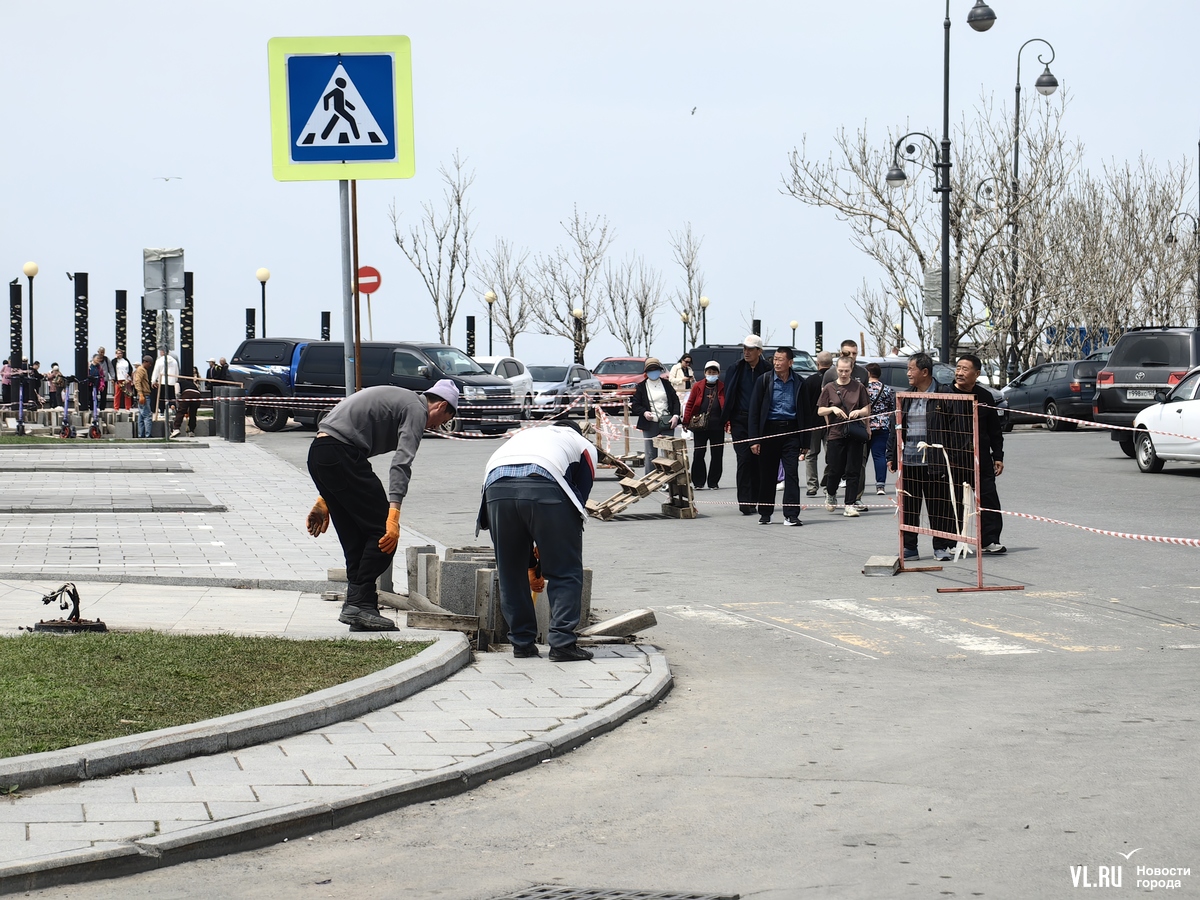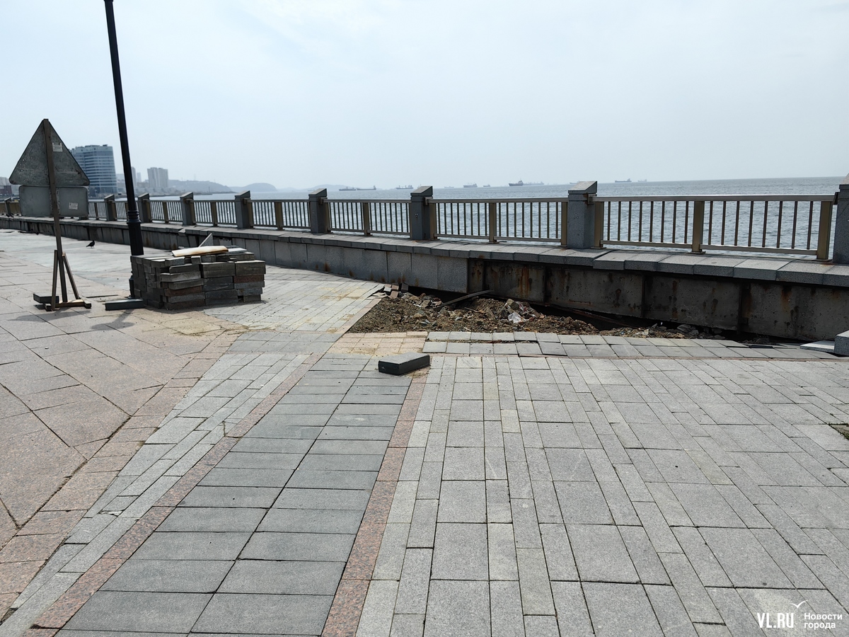 На набережную от старого океанариума до конца спорткомплекса «Олимпиец» сейчас лучше не ходить и не заезжать. Здесь без предупреждения начались ремонтные работы. Часть пешеходной зоны огорожена сигнальными лентами, здесь поднимают гранитную плитку. Попасть можно к бетонной рампе и вдоль неё пройти дальше, в сторону яхт-клуба «Тихий океан». Вдоль парапета пройти сейчас не получится.