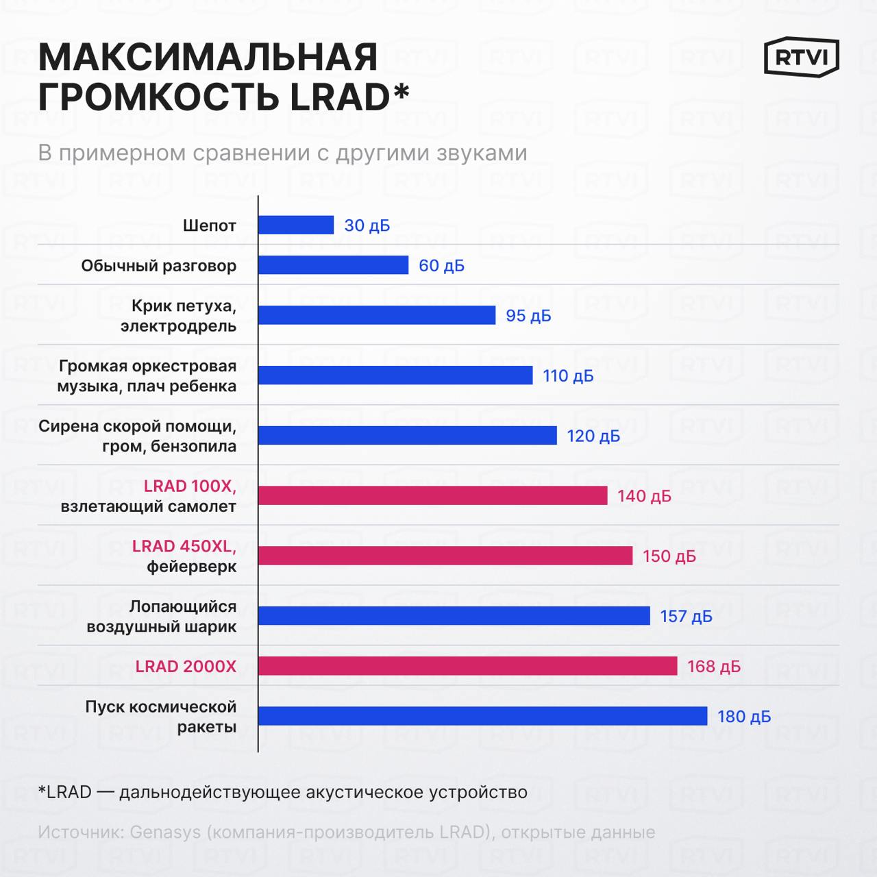 Самый яркий пример «звуковой пушки», которую, например, применяли для разгона протестов в США, — это дальнодействующее акустическое устройство (LRAD, Long Range Acoustic Device), изначально созданное для военных целей.