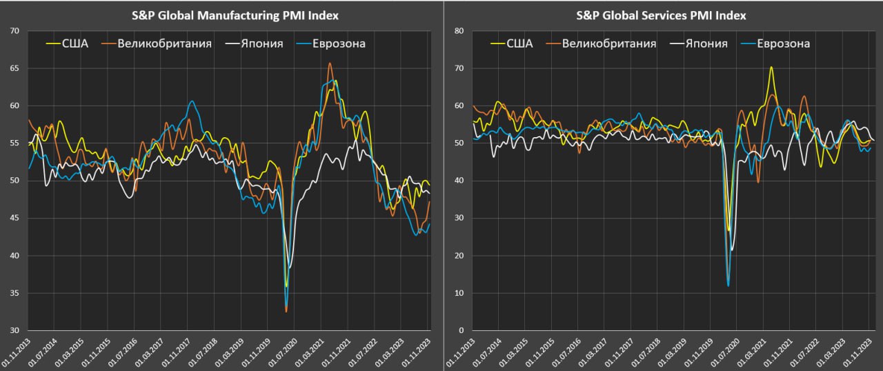 Услуги, формирующие основную часть ВВП развитых стран, удерживали экономику от срыва, но и услуги развернулись с июня 2023 (улучшение ожиданий бизнеса с октября 2022 по май 2023 завершилось, не успев реализоваться).