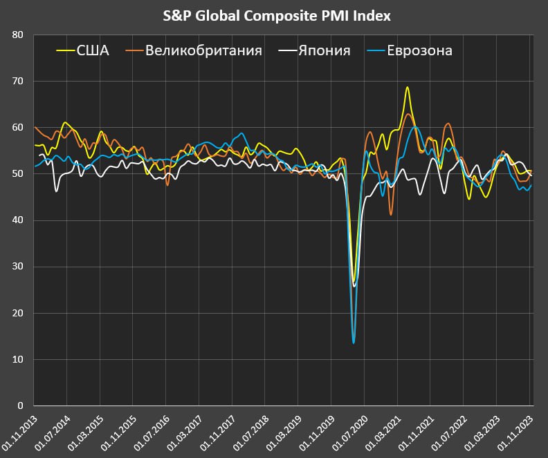 S&P Global Services PMI / Manufacturing PMI и обобщенный Composite PMI демонстрирует деловую активность в секторе услуг, в производстве и во всей экономике.
