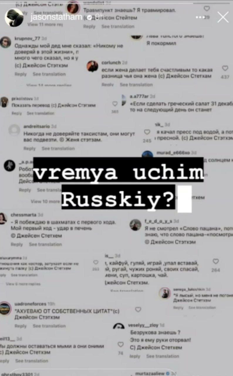 Актёру в запрещенной сети начали писать пацанские слова поддержки от русских людей за его гражданскую позицию по поддержке России и Палестины. Джейсон ответил всем одной фразой, написанной по-русски латиницей: - "время учить Русский?".