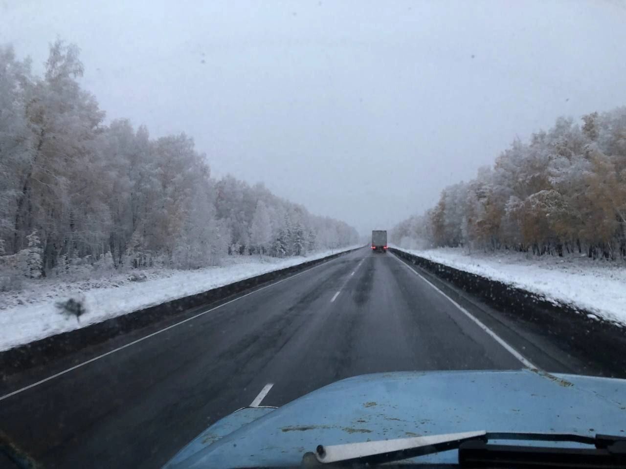 Сегодня утром автомобилисты поделились кадрами заснеженной трассы Канск-Красноярск. Фотографии сделаны на участке перед Бородино.