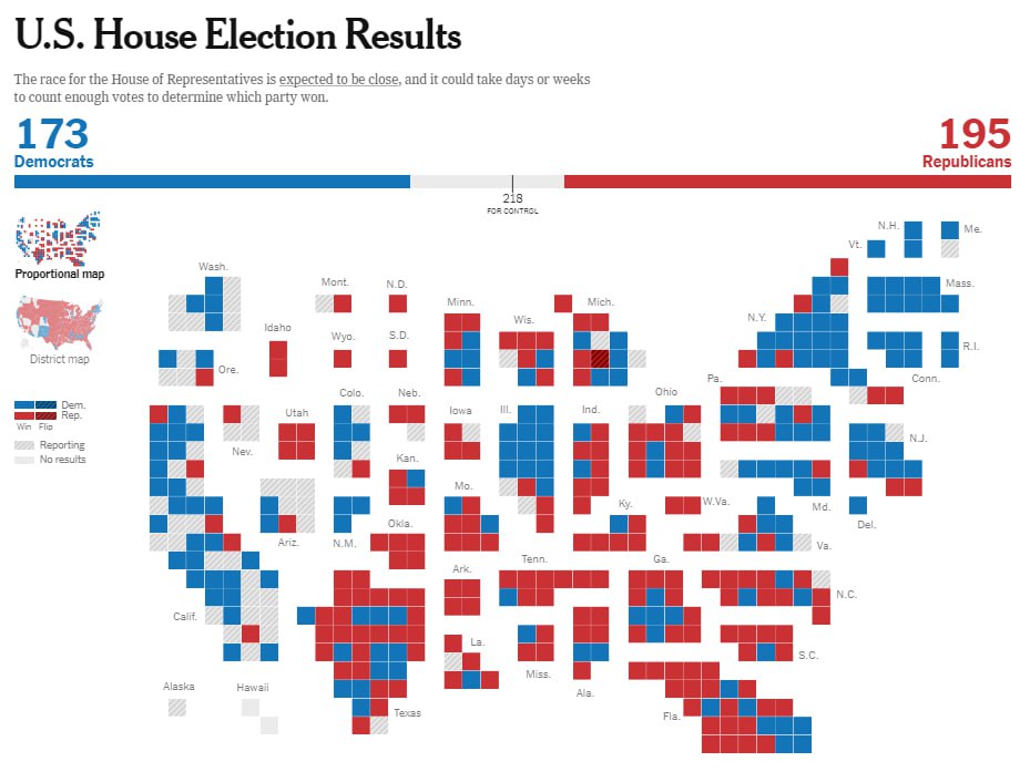 Судя по новостям с участков в США демократы таки проигрывают борьбу за Палату представителей. За последние несколько часов они не только не отбили у республиканцев ни одного округа, но даже потеряли преимущество в одном, где ранее лидировали.