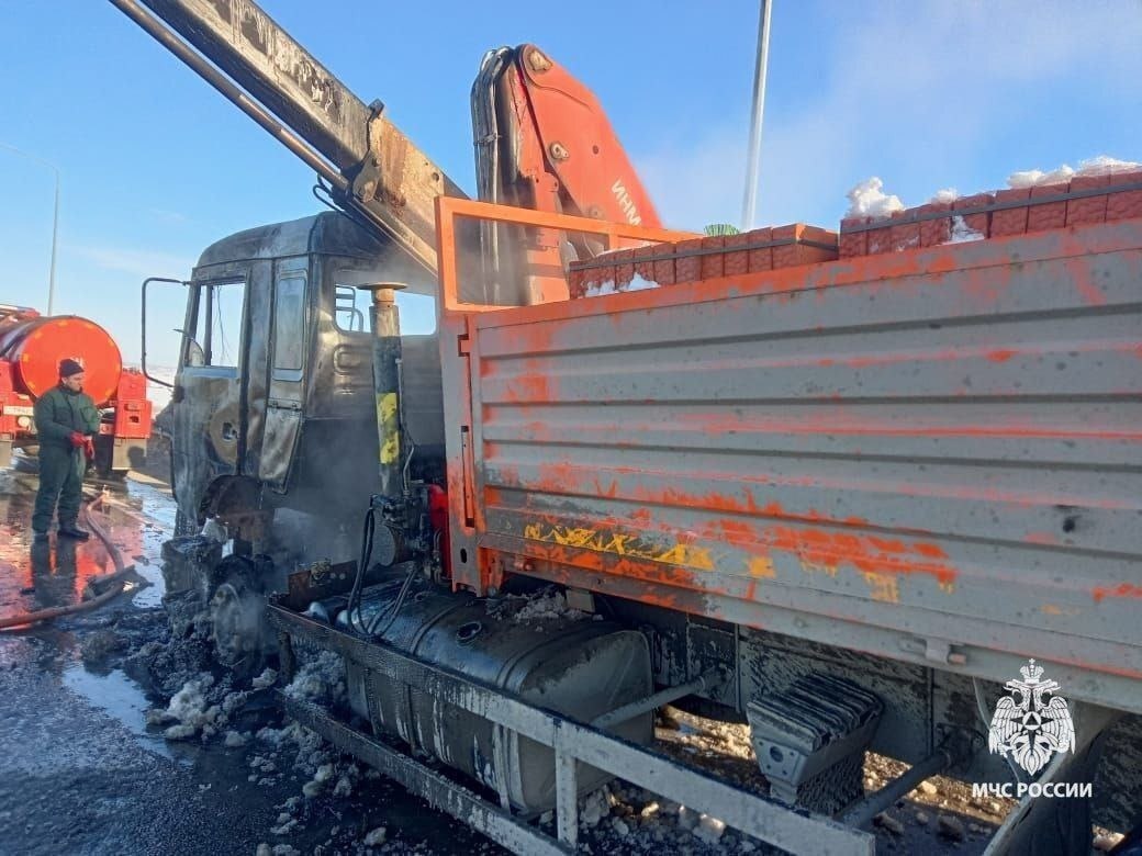 Сотрудники МЧС России совместно с добровольными пожарными оперативно ликвидировали открытое горение. К счастью, никто в огне не пострадал. Огонь успел повредить лишь кабину грузовой машины. Известно, что грузовик вёз кирпичи.