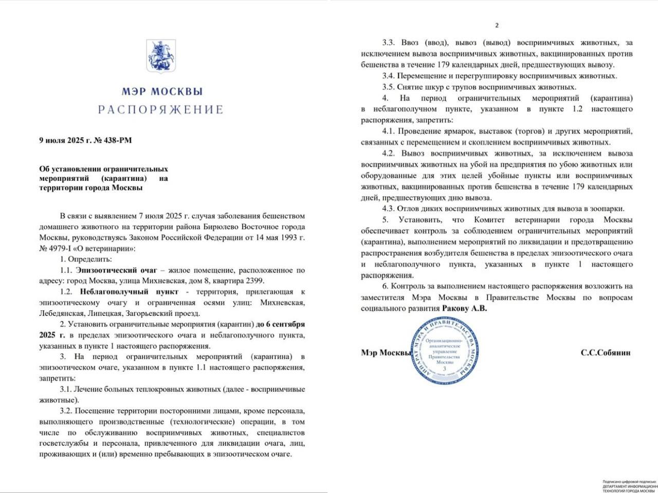 Как сказано в документе, случай заболевания домашнего животного бешенством выявили еще 7 июля на Михневской улице.