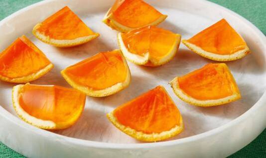 4. Массу вылить в корки от апельсина и поставить в холодильник на 1 час. Разрезать на дольки. Готово!