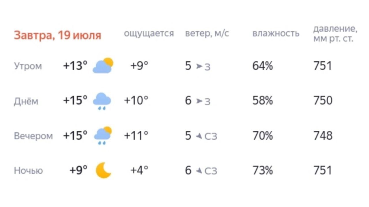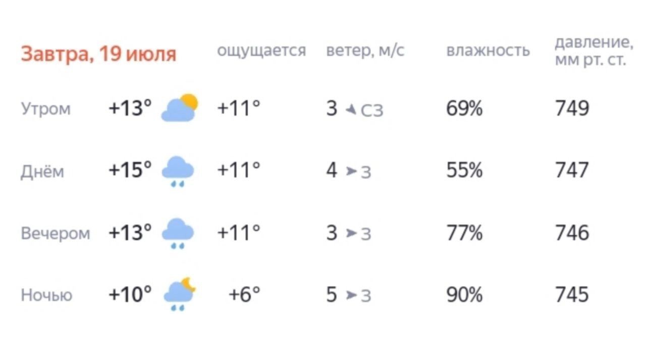 В субботу, 19 июля, средняя температура по Югре днем составит от +14 до +19 градусов, ночью — от +7 до +12 градусов. Исключением станет северная часть региона, где днем будет — +10…+15 градусов, ночью — +4…+9 градусов. По западной части — тоже похолодание: днем местами до +8 градусов, ночью — до +2 градусов. Также прогнозируют сильные дожди. Ветер — северо-западный с переходом в западный, 3-12 м/с. Возможны порывы до 15-18 м/с.