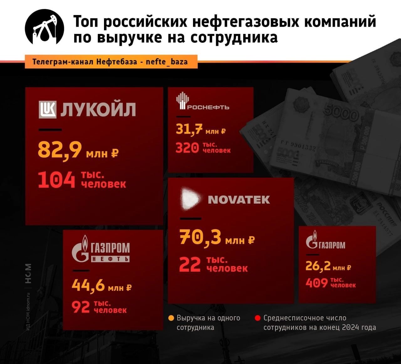 Если сравнивать российских нефтегазовых гигантов с зарубежными отраслевиками, то первые значительно уступают вторым. Например, один сотрудник Saudi Aramco (национальная нефтяная компания Саудовской Аравии) приносит 6,4 млн долларов (при курсе 101 рубль за доллар на конец 2024 года — 646,4 млн рублей), сотрудник американской нефтяной Exxon — 3,7 млн (или 373,7 млн рублей), Shell — 3 млн долларов (или 303 млн рублей).
