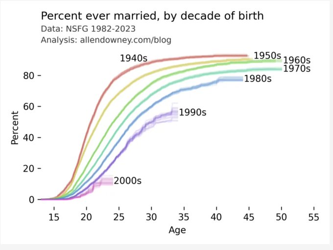 Как мы видим, каждое последующее поколение, начиная с тех, кто родился в 1940-е, всё позже создаёт семью, или не создаёт её вовсе.