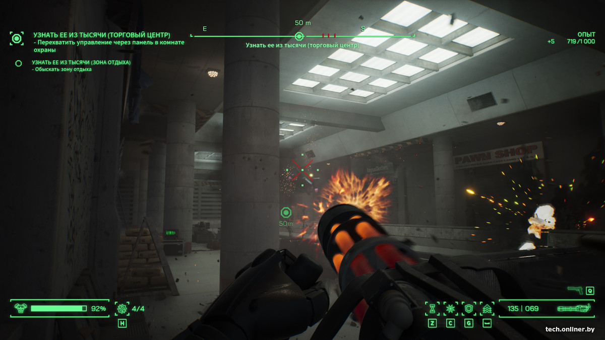 Скучно? Нет, ни разу. Напротив, все эти перестрелки веселят, особенно когда удается расправиться с ватагой летающих ботов или катающимися по полу робобомбами без получения урона (может, на максимальном уровне сложности иначе). Задорно можно подавить очередную группу наемников: вначале легковооруженных, затем — со все более нарастающей огневой мощью и броней. Такие уже требуют наличия какой-никакой стратегии и следования ей.