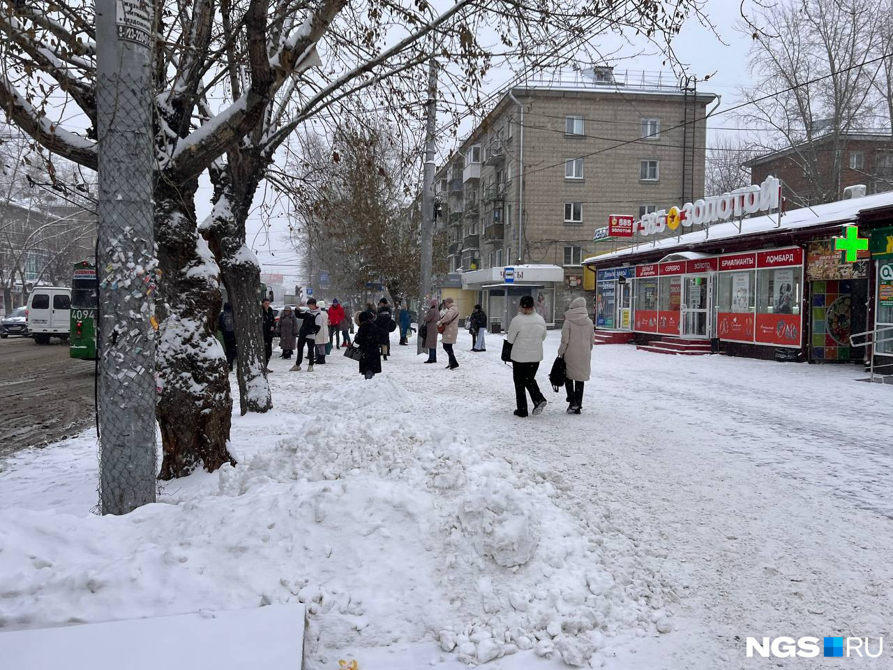 Мини-рынок расположился на проспекте Маркса сразу за остановкой общественного транспорта в направлении правого берега. На остановке стоят люди, за ними — крытый не то магазин, не то павильон с филиалом известной ювелирной сети, отделом с фруктово-овощной продукцией, офисом быстрых займов и аптекой. Но остались торговцы и на улице: прямо рядом со зданием продают зимние куртки и головные уборы. Торгуют в небольшом контейнере с навесом, но часть товара висит и мокнет под снегом. Куртки и пуховики развешаны между отделами с фруктами и овощами.