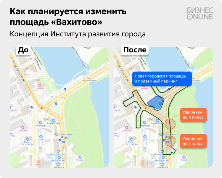 «Здесь концентрируется большое количество жителей, поэтому площадь Вахитова должна стать красивым акцентом», — считает один из экспертов. Но как это сделать? Одна из идей — отказаться от прямого проезда потока по Назарбаева в сторону улицы Тукая. В этом случае территория у бывшей конторы завода Крестовниковых получит свободный участок, где может появиться новая городская площадь. А под ней авторы концепции предлагают построить подземный паркинг. В идеале, конечно, строительство паркинга сделало бы погоду всем объектам на этой территории — и театру, и набережной, и обновленному зданию конторы завода братьев Крестовниковых. Достаточно вспомнить споры о том, что посетителям нового театра не хватит парковочных мест. Впрочем, это из серии дискуссионных идей, потому что планам могут помешать инженерные сети и сложная геология участка.