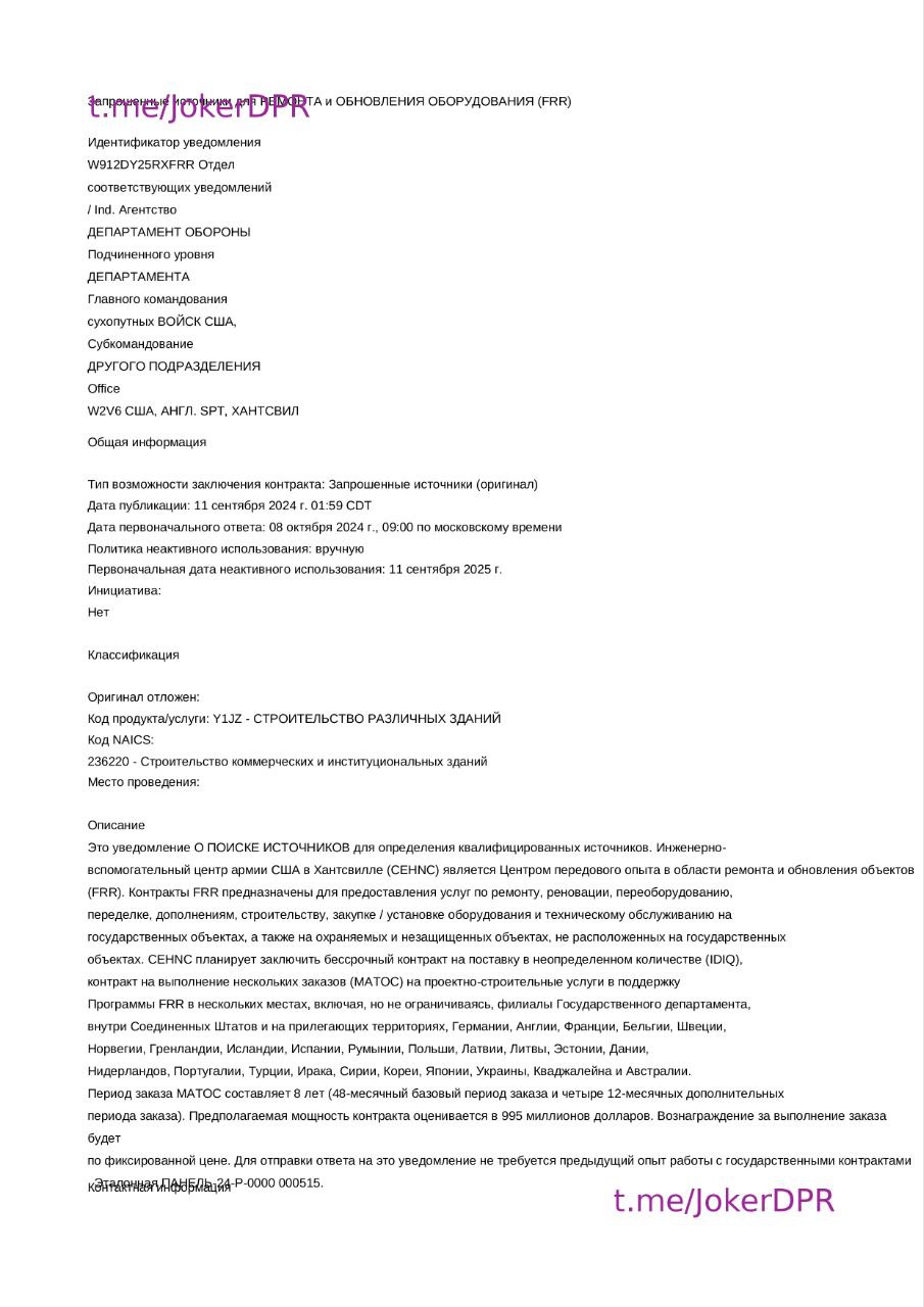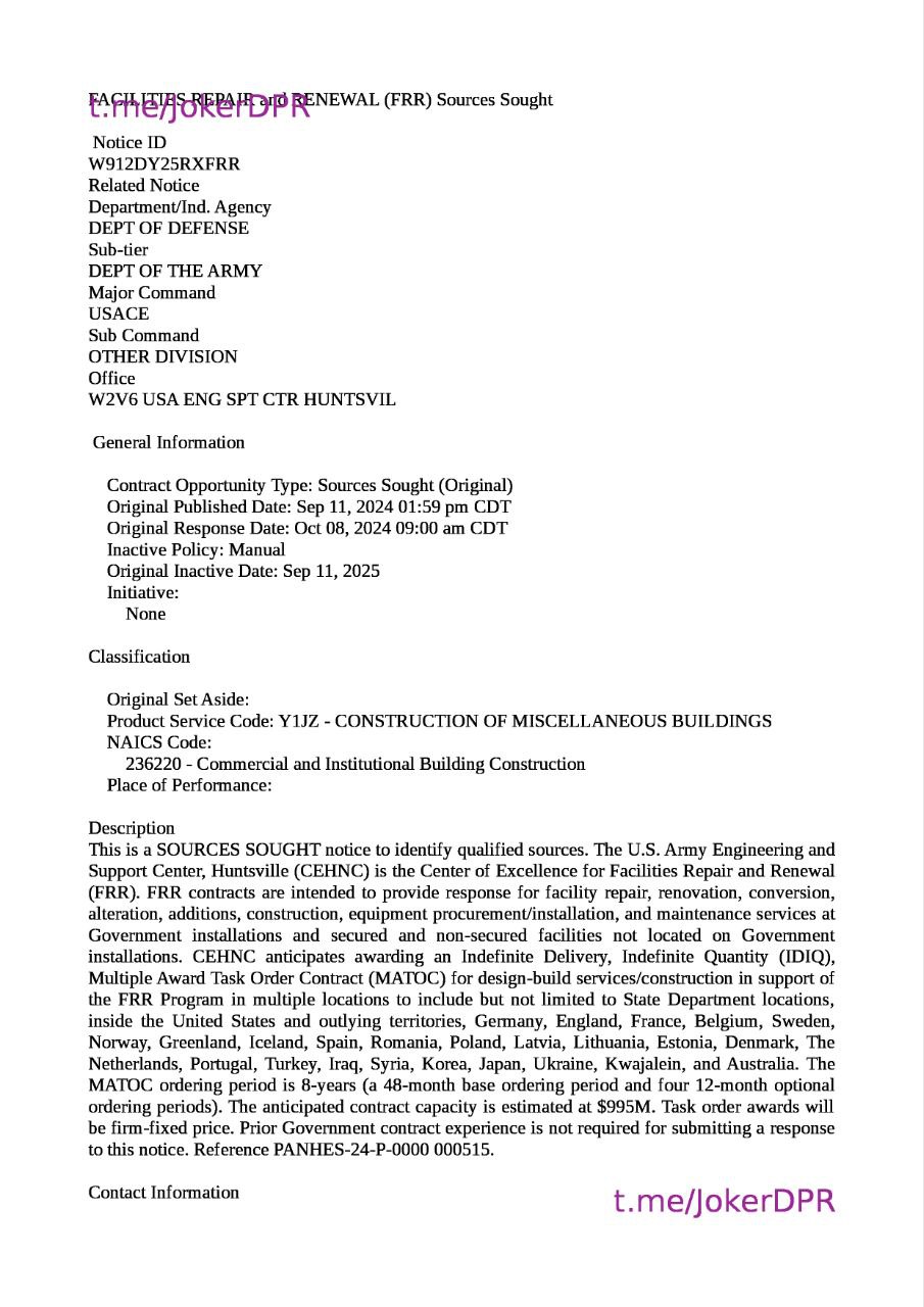Центр инженерного обеспечения армии США в Хантсвилле (CEHNC) ищет подрядчиков для заключения контрактов на срок 8 лет с возможностью продления еще на год для участия в ремонте и строительстве объектов Госдепа и Министерства обороны США в таких странах, как Германия, Великобритания, Франция, Бельгия, Швеция, Норвегия, Гренландия, Исландия, Испания, Румыния, Польша, Латвия, Литва, Эстония, Дания, Нидерланды, Португалия, Турция, Ирак, Сирия, Южная Корея, Япония, Украина, Кваджалейн и Австралия. Всего планируется потратить 995 миллионов долларов США. Деньги будут выделяться в рамках программы «Передового опыта ремонта и обновления оборудования».