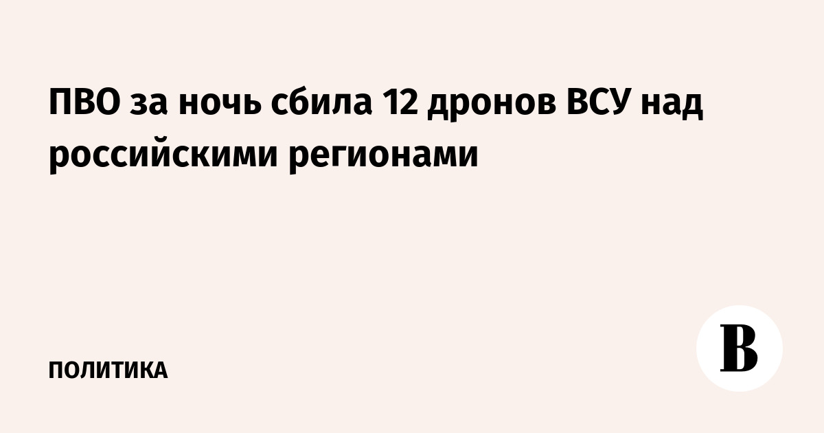 Российские дежурные средства ПВО за ночь перехватили и уничтожили 12 украинских беспилотных летательных аппаратов, сообщили в Минобороны.