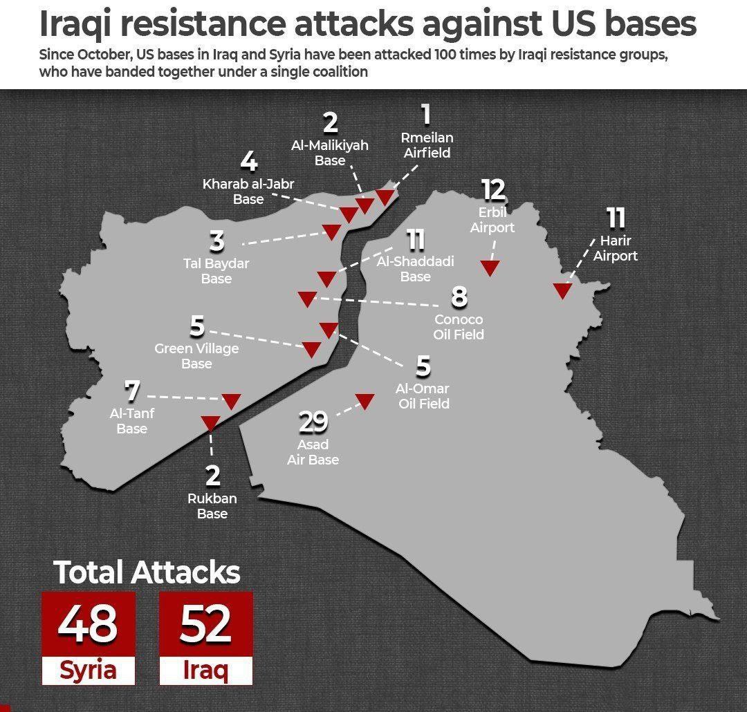 Атаки на американские базы в Ираке совершенные иранскими прокси. До недавних времен, даже 1 атака на американскую базу была ЧП мирового масштаба. А нынче это уже просто рутина.