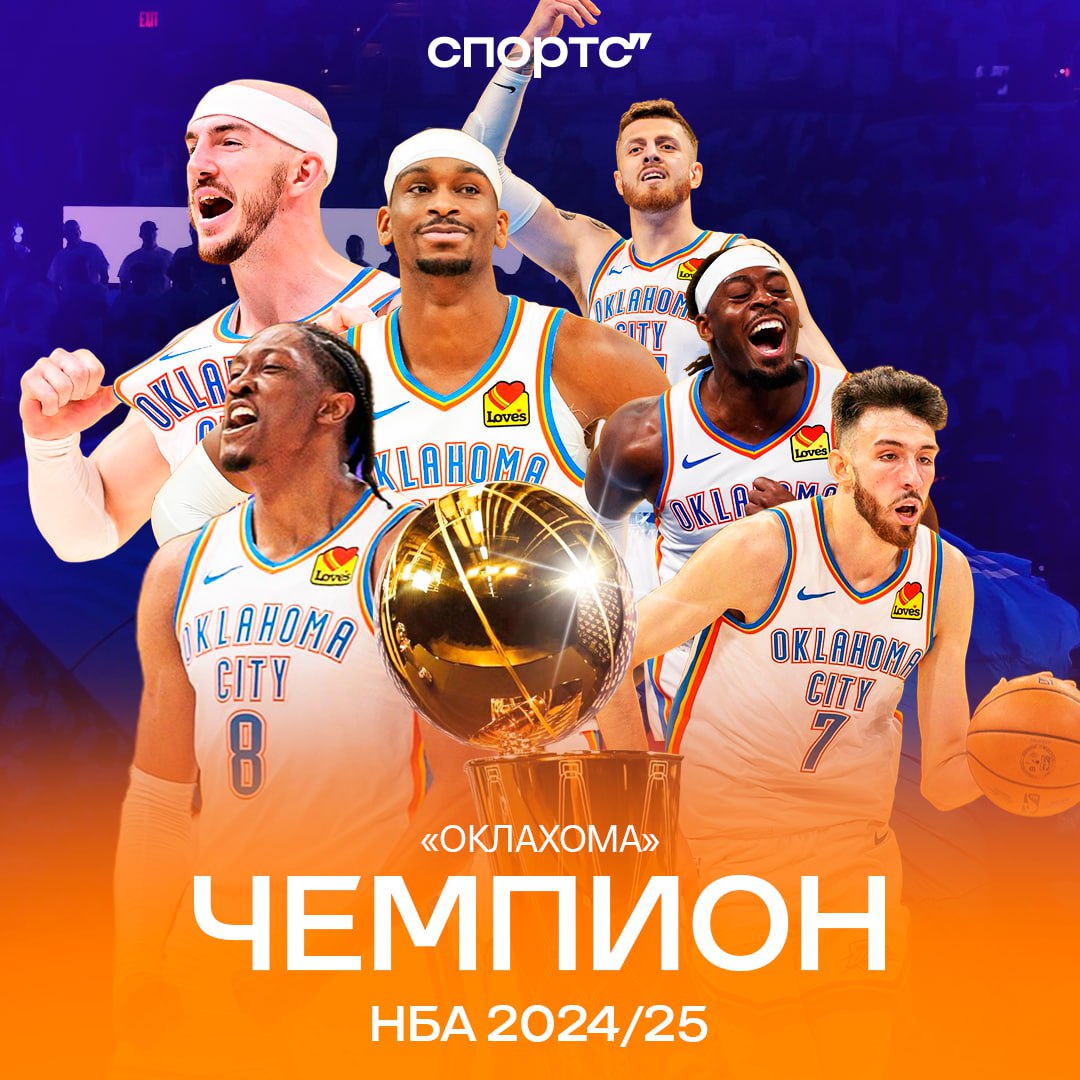 ‼️🏀 «Оклахома» становится чемпионом НБА! В решающем седьмом матче финальной серии дома обыграли «Индиану», которая по ходу потеряла Халибертона с серьезной травмой и остановилась в шаге от первого Кубка Лэрри О'Брайена