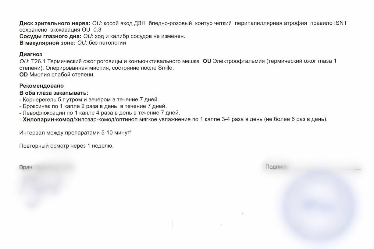В Диагностическом центре № 7 ей диагностировали электроофтальмию глаз и отпустили домой. Врачи частной клиники «Зрение» констатировали термический ожог роговицы и конъюнктивы.