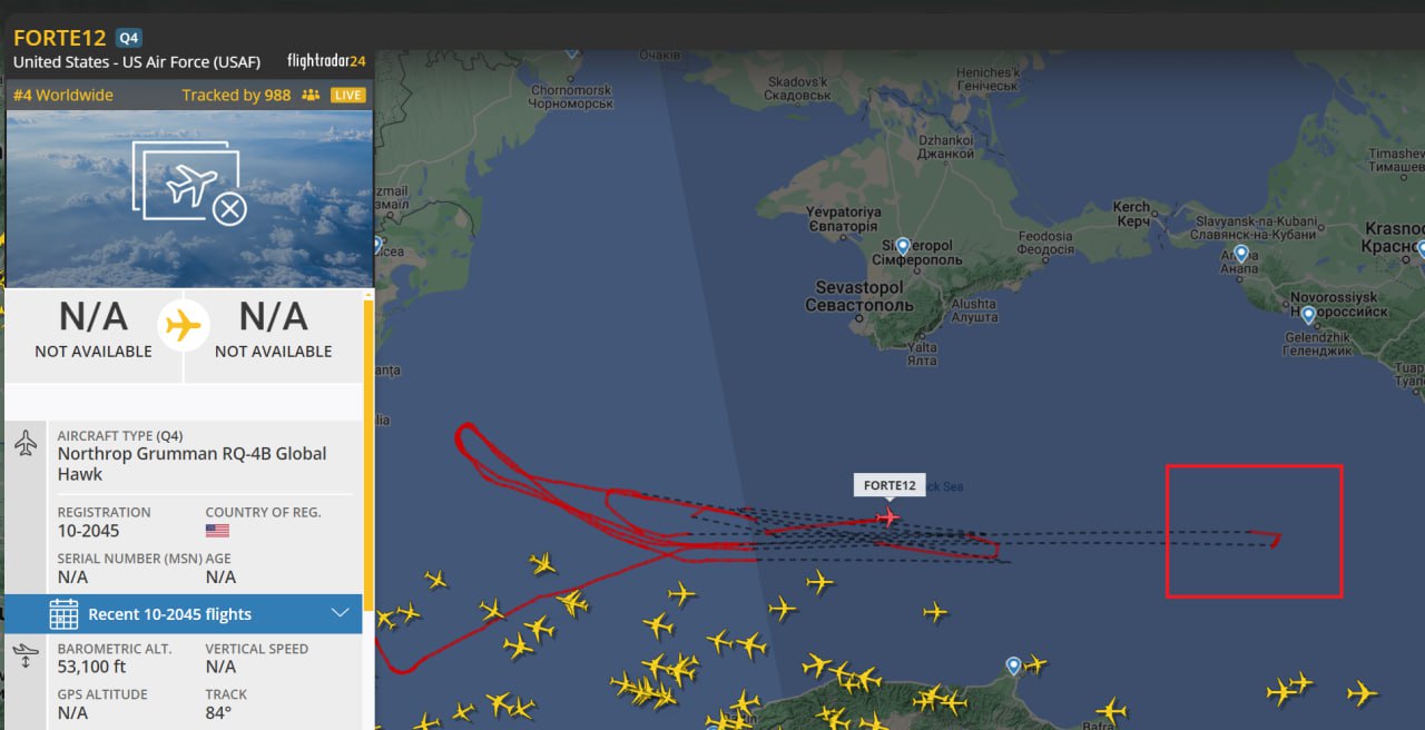 Как и ожидалось, в течение дня Global Hawk как минимум один раз приближался к российскому побережью в районе Сочи. Это если брать доступные данные по маршруту с включенным транспондером. Большую часть дня дрон работает без него.