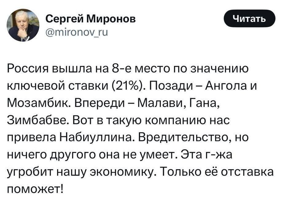 Депутат Сергей Миронов хочет отправить в отставку главу ЦБ из-за высокой ключевой ставки. Он считает, что глава ЦБ угробит экономику России. Возможно, что он предпочтет огромную инфляцию