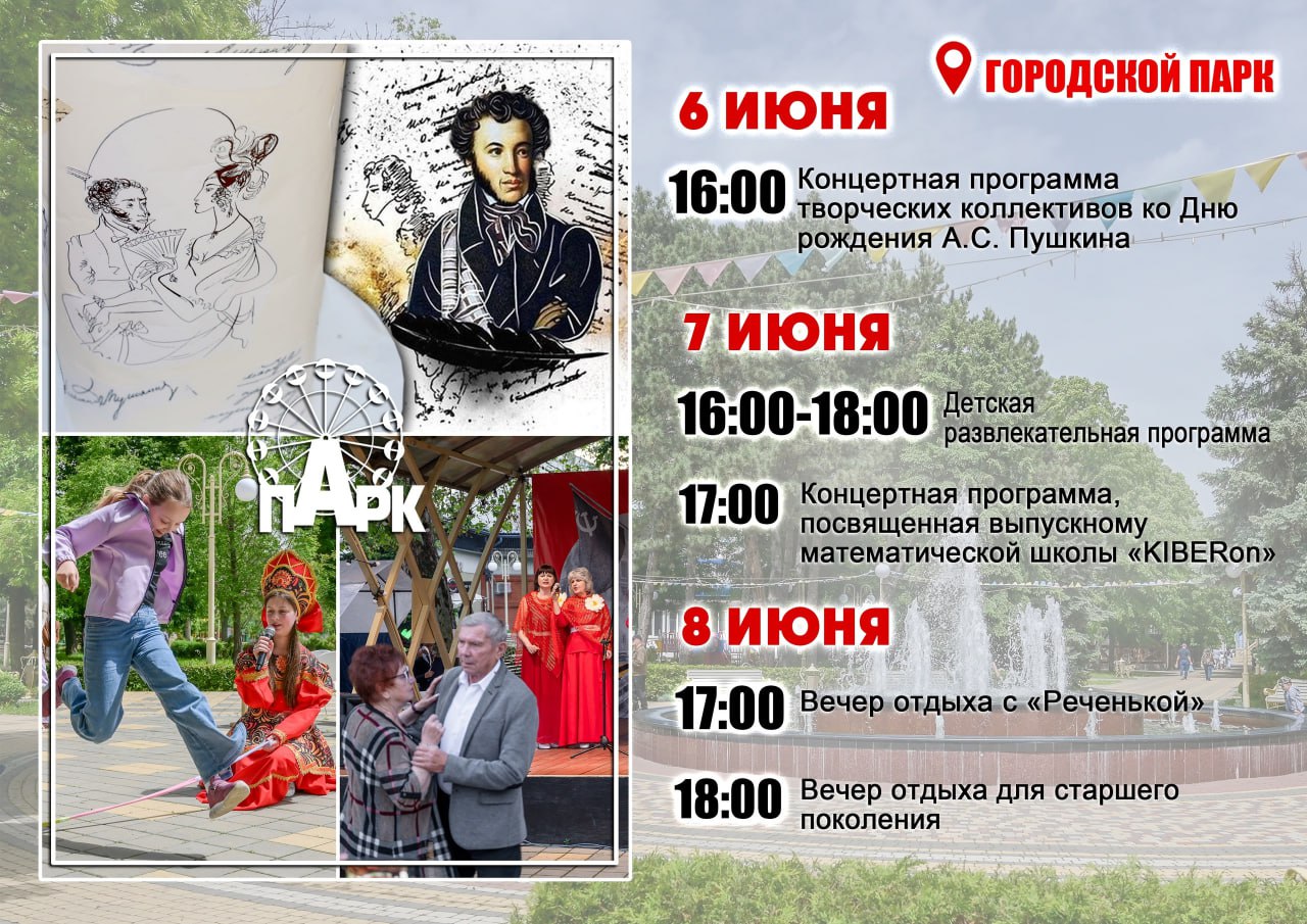 В Городком парке 6 июня в 16:00 запланирована концертная программа ко Дню рождения А.С, Пушкина.