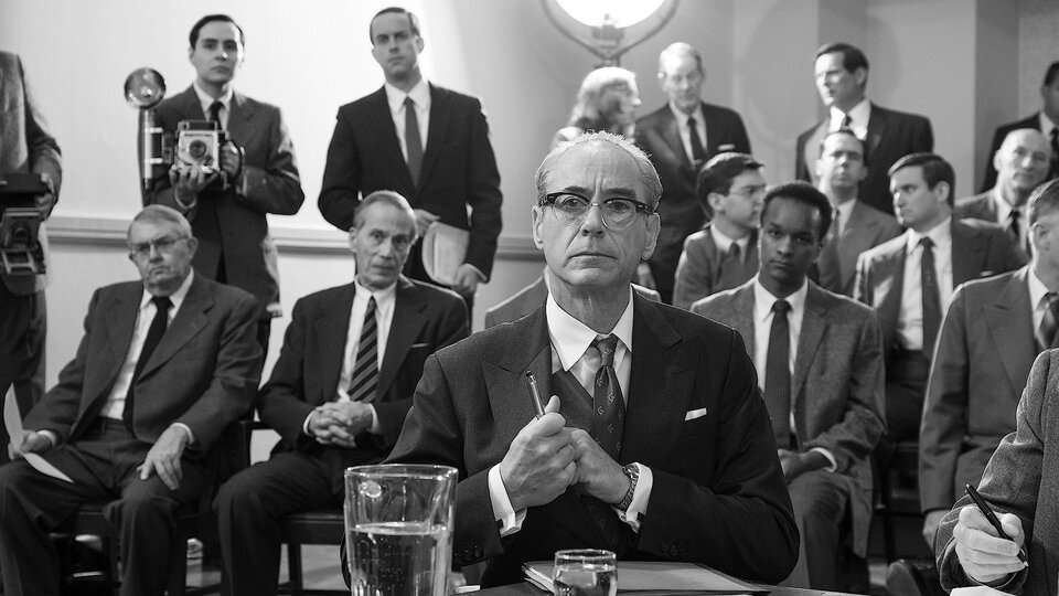 Нолан вроде бы использует очень заезженный формальный прием: героя и его знакомых допрашивают представители Комиссии по атомной энергии (не суд, как они все время подчеркивают, но по виду да и по сути именно он) на предмет его лояльности отчизне: на дворе заря холодной войны и эпоха маккартизма, охота на коммунистических ведьм. И это обрамление позволяет структурировать флешбэки, представлять людей, задавать наводящие вопросы и так далее.
