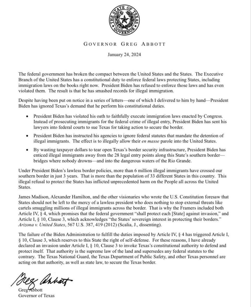 Вчера губернатор Техаса объявил «режим вторжения», который ставит местные законы выше федеральных, игнорирует федеральных судей и приказы Байдена и принимает помощь от других (на данный момент пяти) республиканских губернаторов штатов.