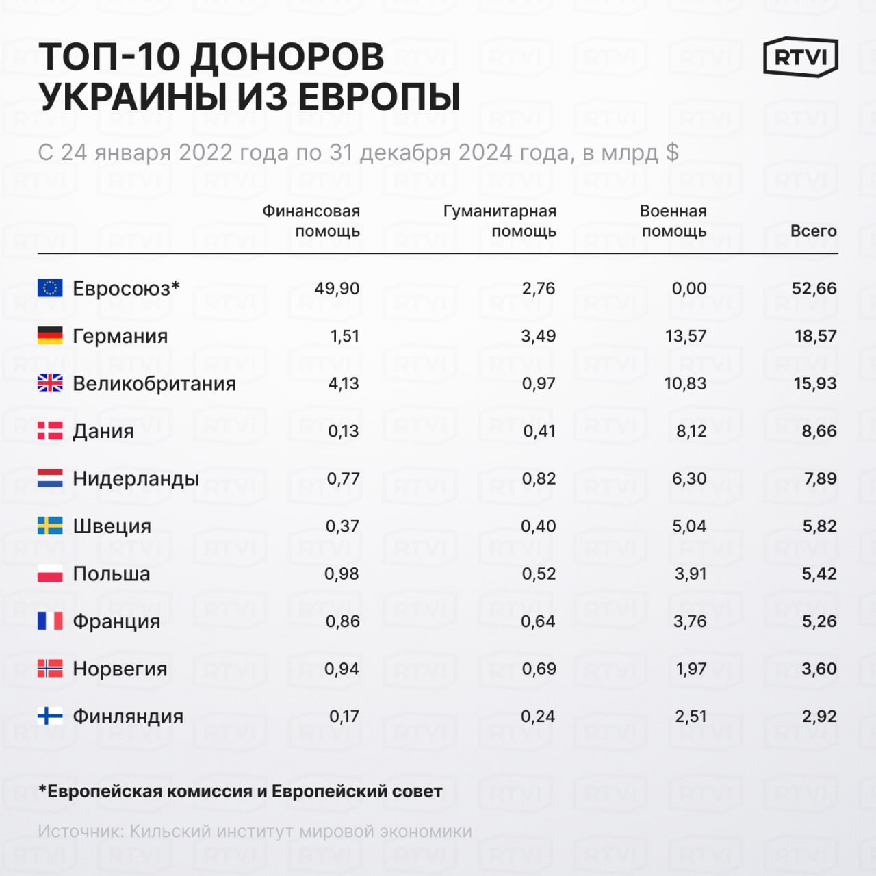 Страны Европы и институты ЕС все вместе также выделили Киеву большую сумму — около $142 млрд, согласно данным Кильского института мировой экономики. Среди главных доноров — Германия, Великобритания и Дания.