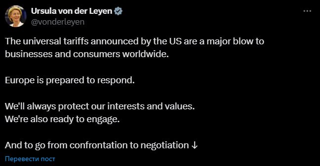 "Универсальные тарифы, объявленные США, - это серьезный удар по бизнесу и потребителям во всем мире. Европа готова ответить. Мы всегда будем защищать наши интересы и ценности. Но мы также готовы к взаимодействию и переходу от конфронтации к переговорам", - сказала она.