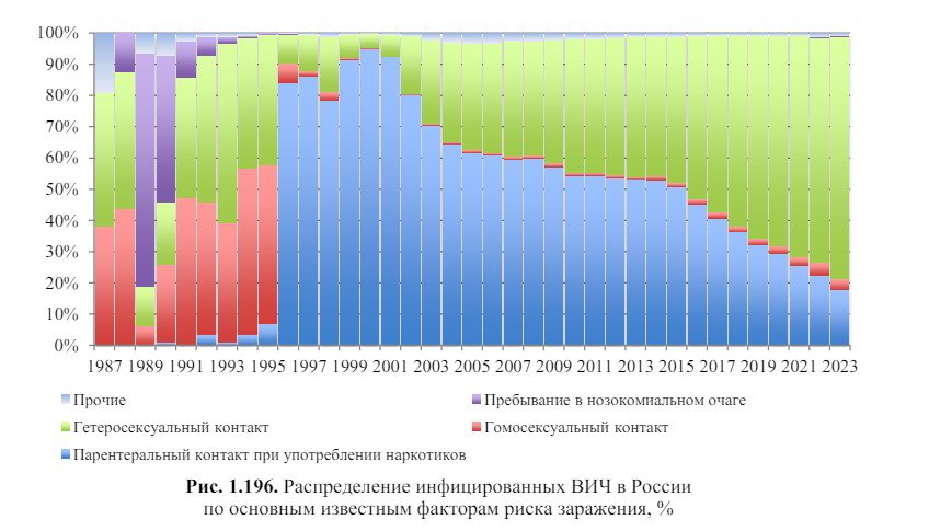 Причём сейчас, как отмечает РПН, заражение смещается в сельскую местность (где ещё есть слабые представления о способах защиты от ВИЧ). В частности, «заболеваемость ВИЧ-инфекцией среди детей, проживающих в сельской местности в 2023 г. (1,96 на 100 тыс. населения) была выше, по сравнению с общей заболеваемостью детей (1,79 на 100 тыс. населения соответствующего возраста)».