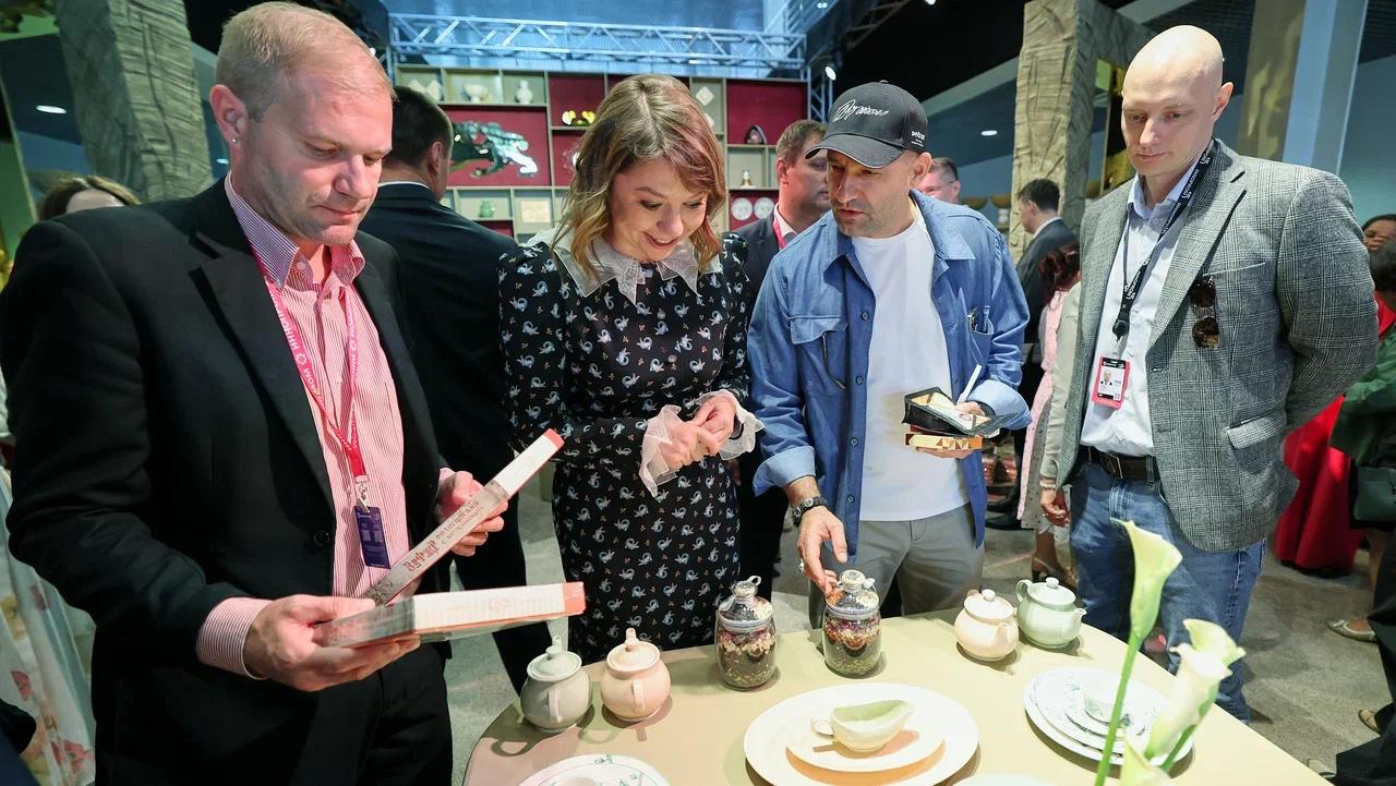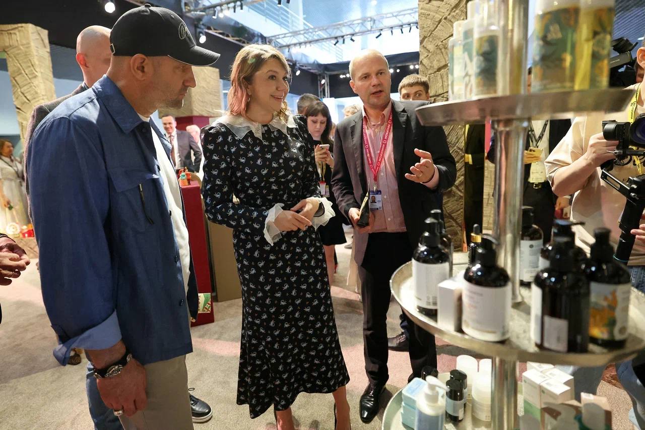 В ходе осмотра экспозиции полпреду были представлены товары стенда. Особое внимание было уделено домашней утвари и изделиям народных промыслов: хохломской и гжельской росписи, дымковской игрушке, вологодским кружевам и другим уникальным произведениям, сочетающим традиции и современные технологии.