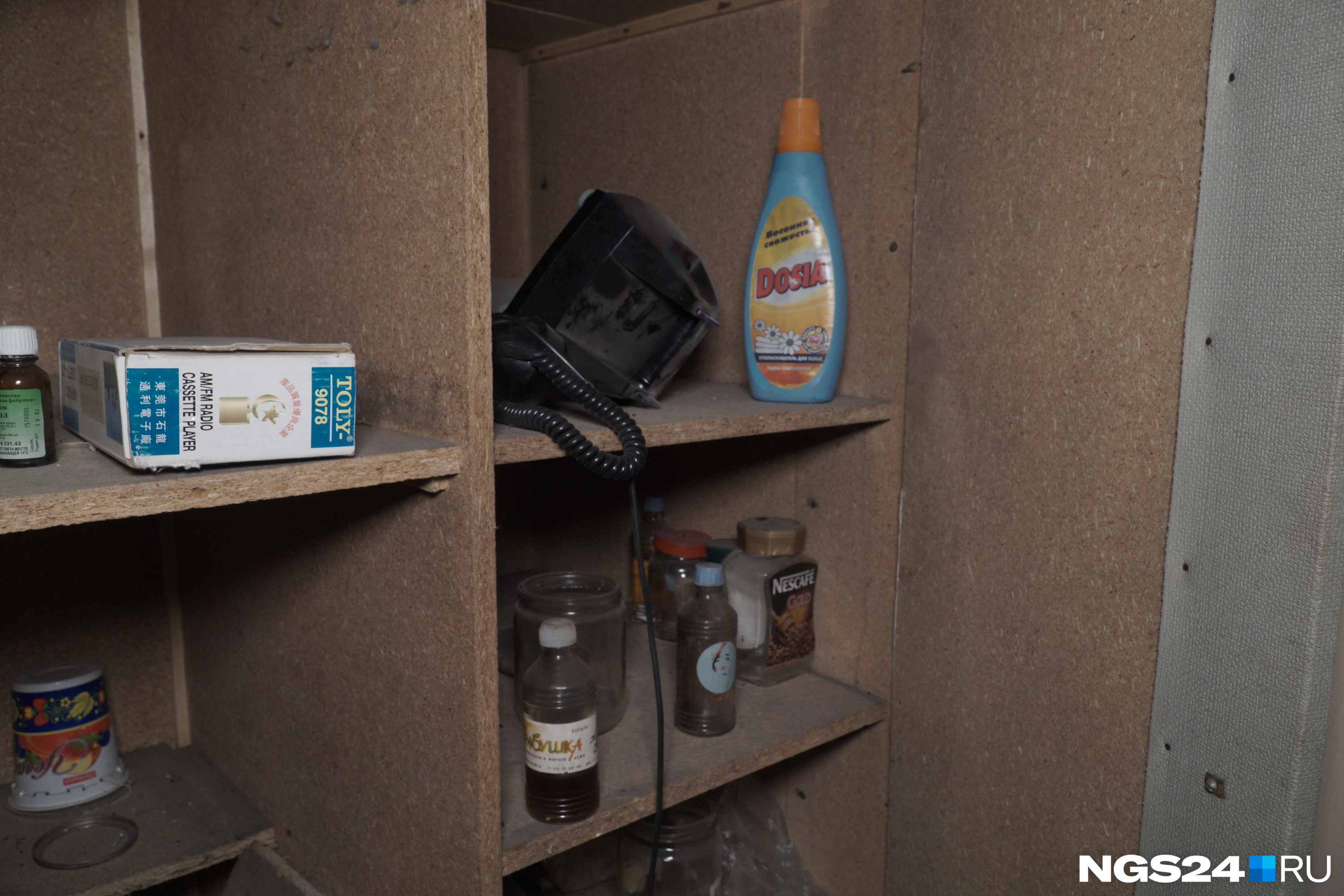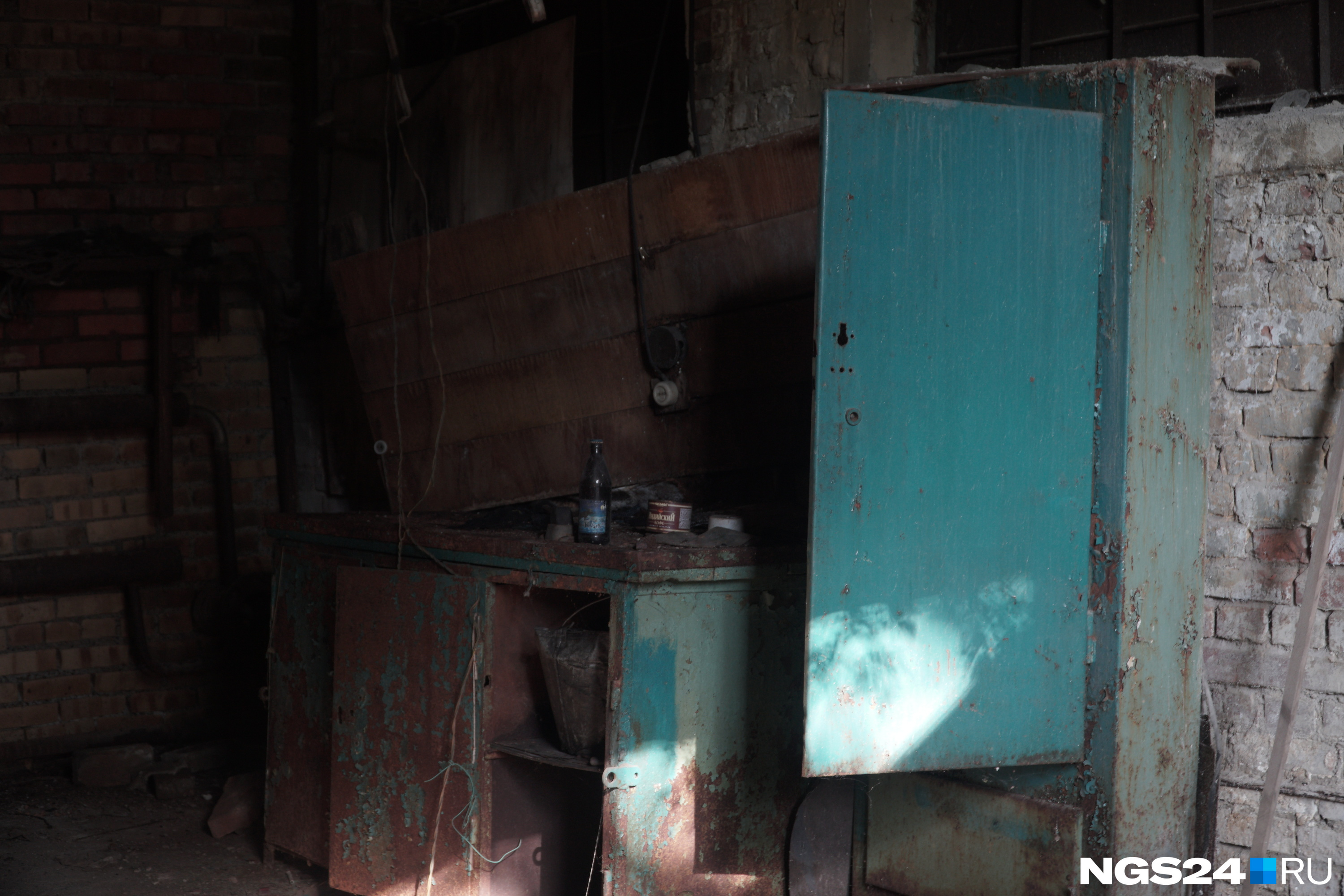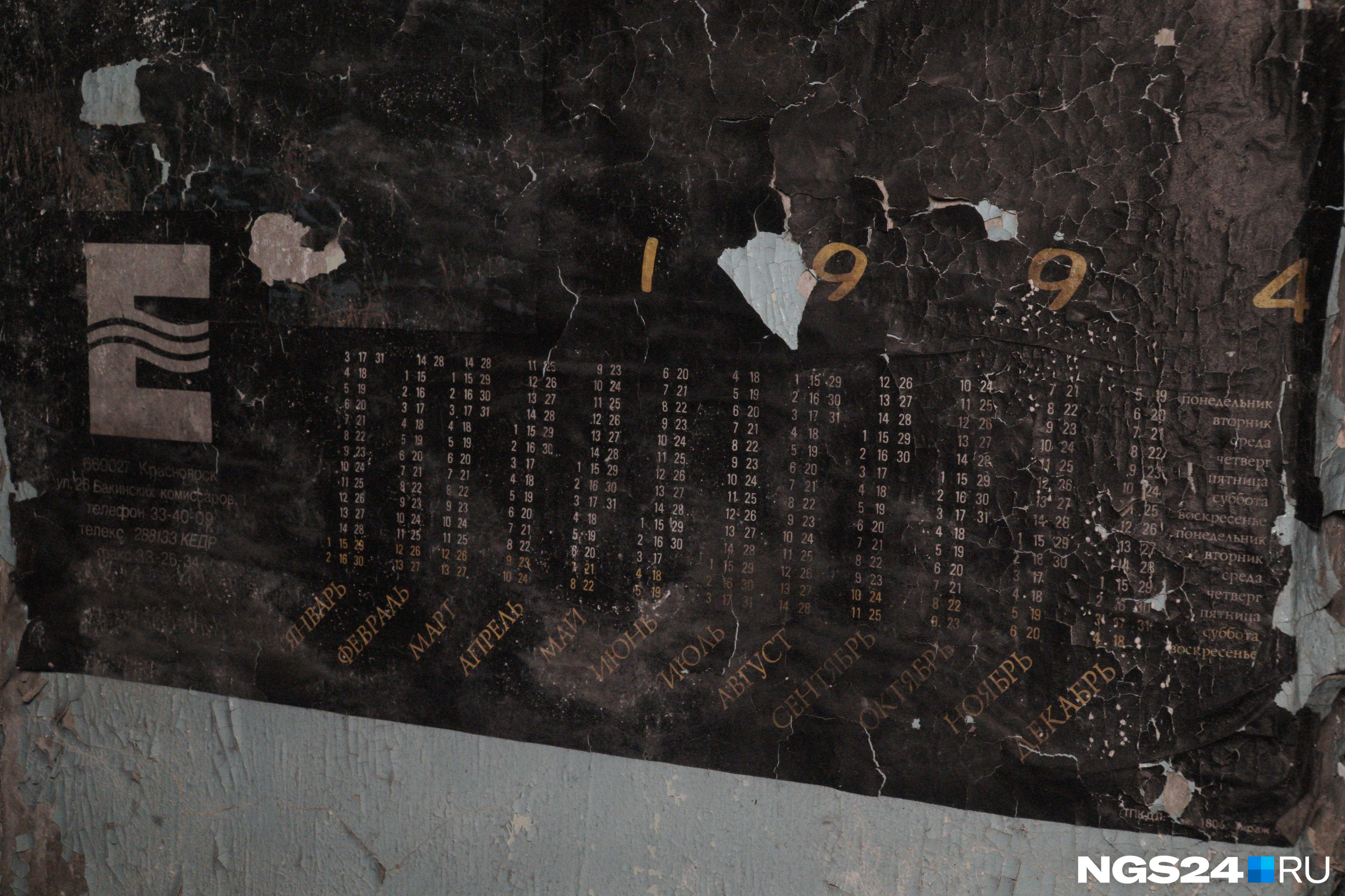 Во второй комнате мы увидели полусгоревший настенный календарь 1994 года с логотипом «Енисея». Похоже, в этой комнате была раздевалка для бывших сотрудников комбината, это стало понятно по множеству узких полок вдоль помещения. Старенький телефон на проводе заставил влюбиться в себя, сразу захотелось вернуться в нулевые.