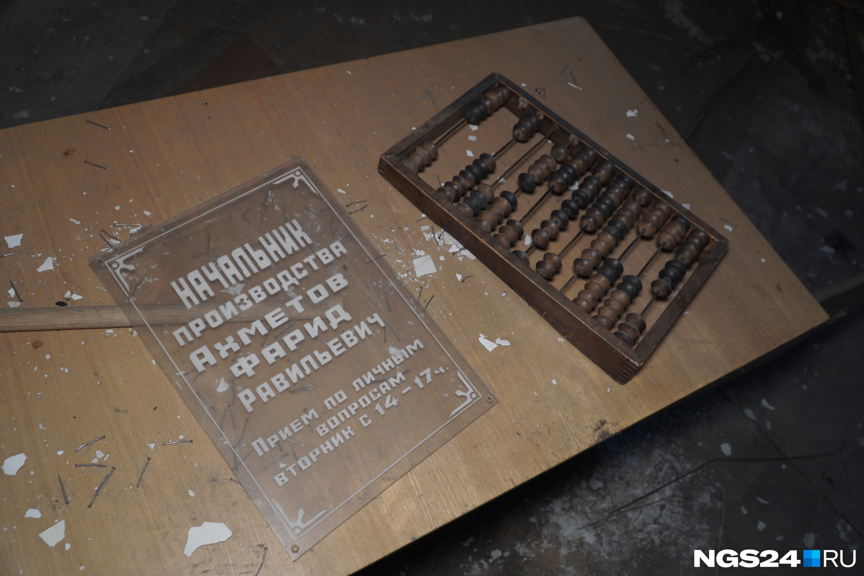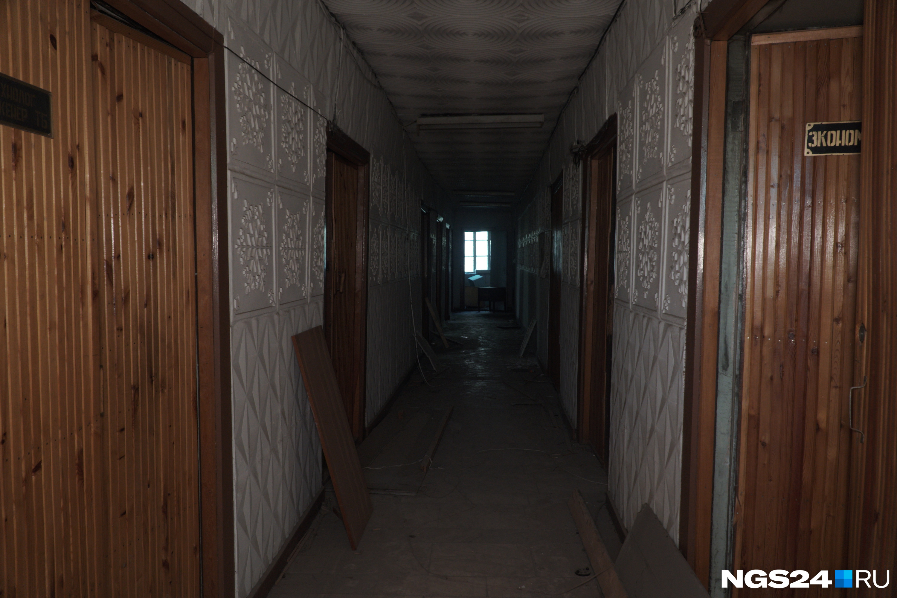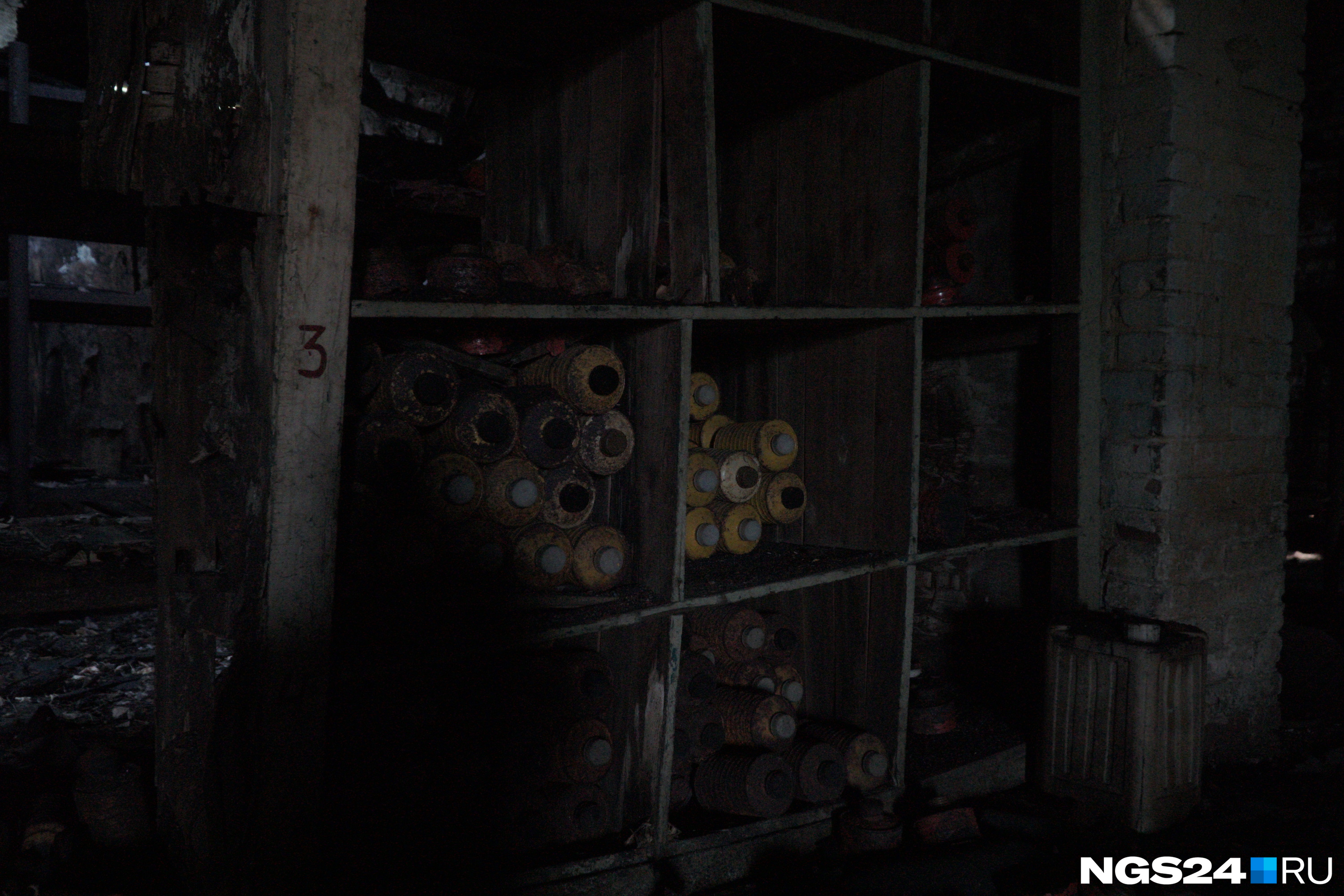 Во второй комнате мы увидели полусгоревший настенный календарь 1994 года с логотипом «Енисея». Похоже, в этой комнате была раздевалка для бывших сотрудников комбината, это стало понятно по множеству узких полок вдоль помещения. Старенький телефон на проводе заставил влюбиться в себя, сразу захотелось вернуться в нулевые.