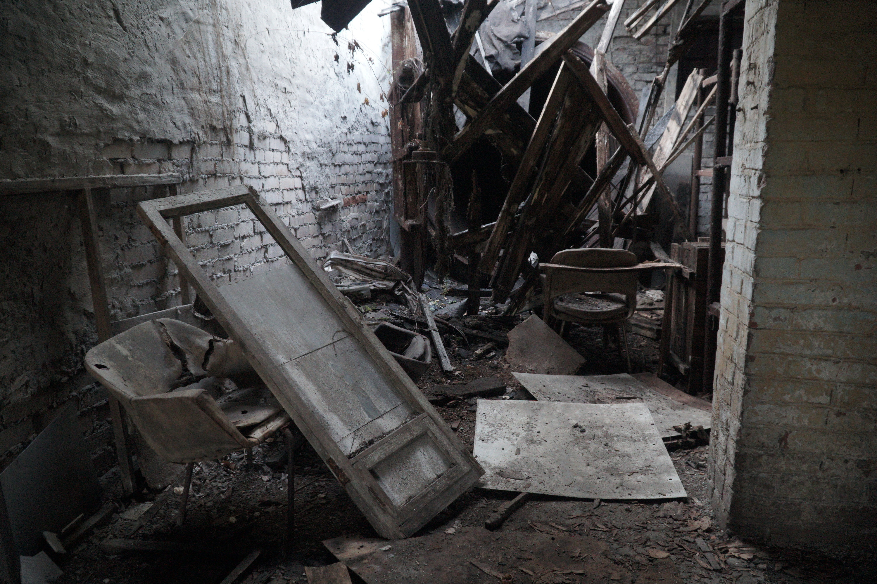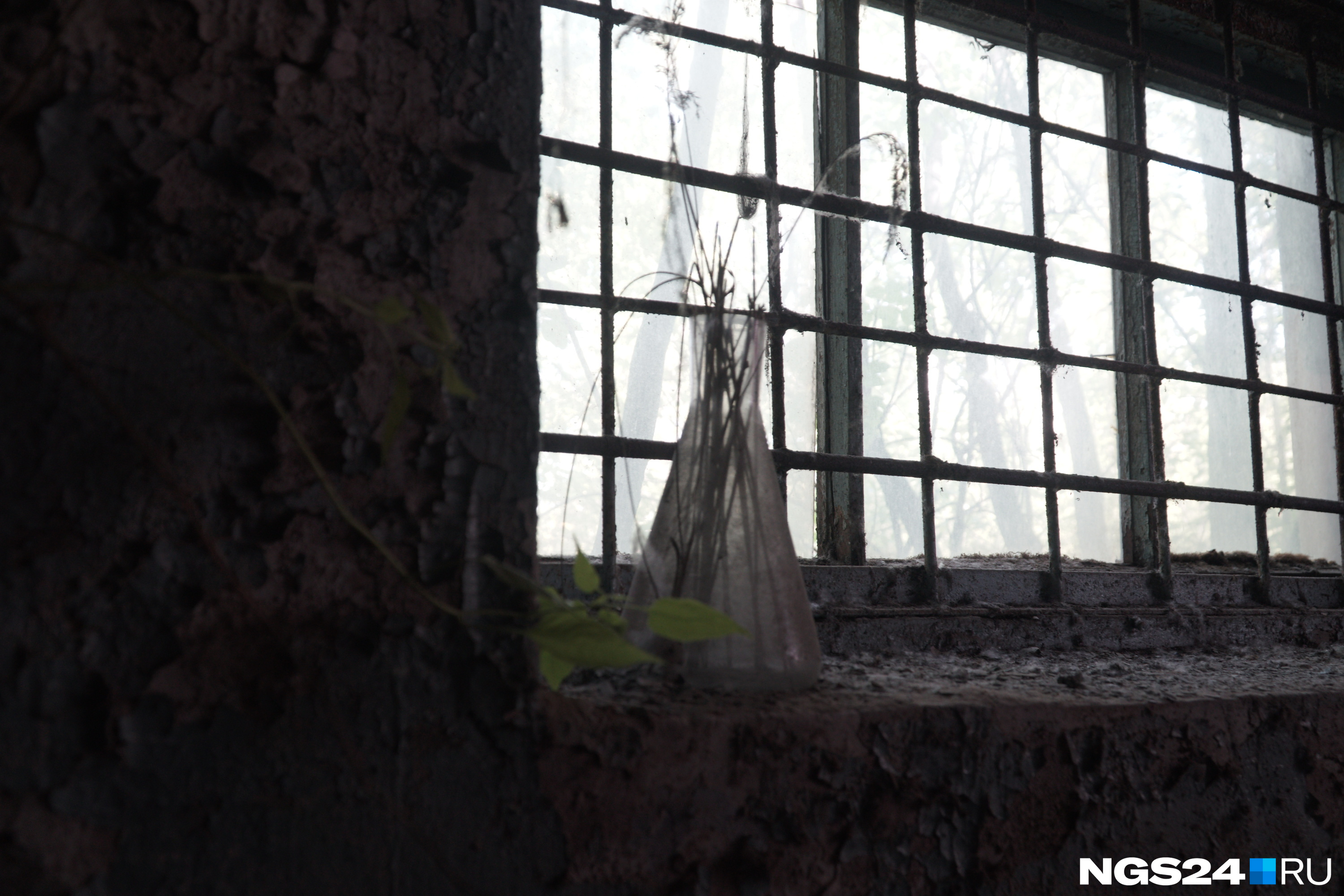 Мы осмотрели две большие темные комнаты квадратов в 120. Повсюду лежала посуда для реагентов, колбы, противогазы, градусники. Впереди частично не было крыши, будто ее кто-то начал сносить. Нас встретила ржавая полка с горой одинаковых железных банок, разбросанная мебель. В помещении пахло сыростью, местами росла трава. Состояние достаточно приличное. Чувство, будто люди в спешке отсюда убежали когда-то. Потому что многие вещи аккуратно лежали на своих местах.