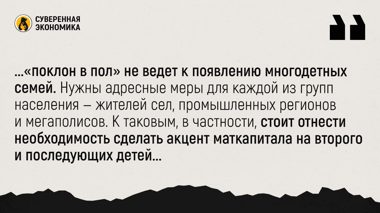 Загвоздка в том, что упомянутый «поклон в пол» не ведет к появлению многодетных семей. Нужны адресные меры для каждой из групп населения — жителей сел, промышленных регионов и мегаполисов. К таковым, в частности, стоит отнести необходимость сделать акцент маткапитала на второго и последующих детей.