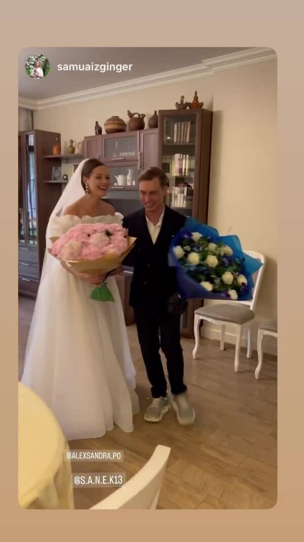 Возлюбленные пригласили на торжество только самых близких, зарегистрировали брак в загсе и отпраздновали это событие дома. Однако даже при таком скромном формате невеста была в пышном белом платье, а Александр надел строгий костюм.