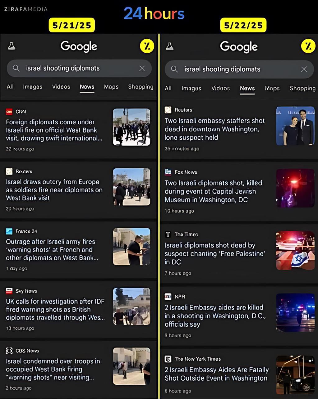 Отмечается, что теперь даже по запросу "Израиль расстреливает дипломатов" Google выдаёт новости о трагедии в Вашингтоне, где сочувствующий палестинцам 30-летний житель Чикаго Элиас Родригес расстрелял двух сотрудников израильского посольства в США у Еврейского музея в Вашингтоне.