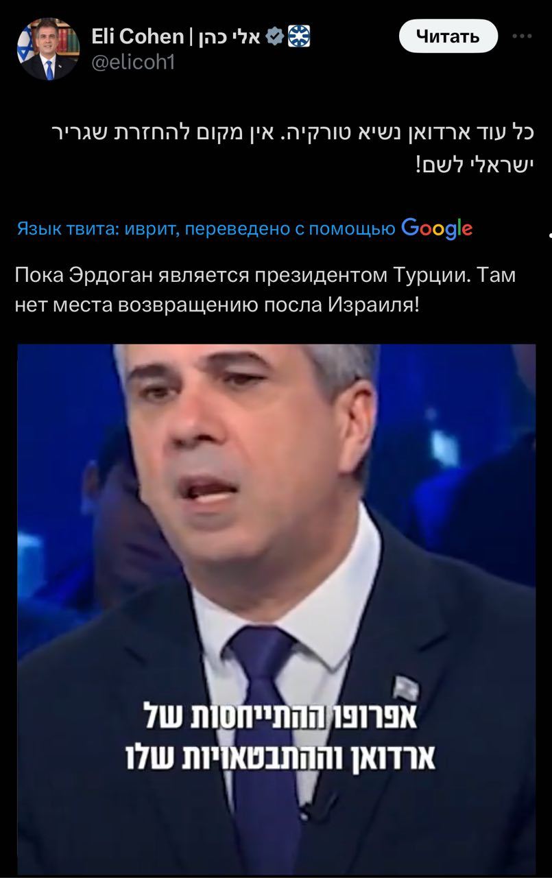 🇮🇱✖️🇹🇷Израиль отказывается возвращать посла в Турцию, пока президентом остается Эрдоган – глава МИД Израиля Эли Коэн