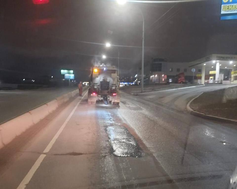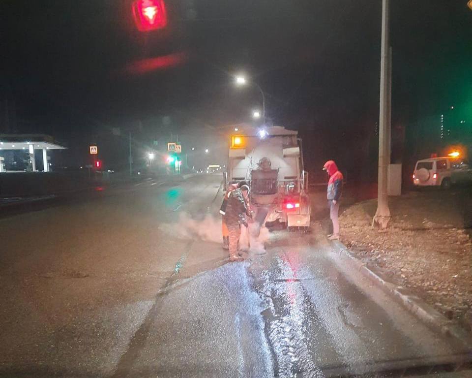 Сегодня ночью там трудились дорожники. Пока в темное время суток сохраняются отрицательные температуры, применяют технологию литого асфальтобетона.