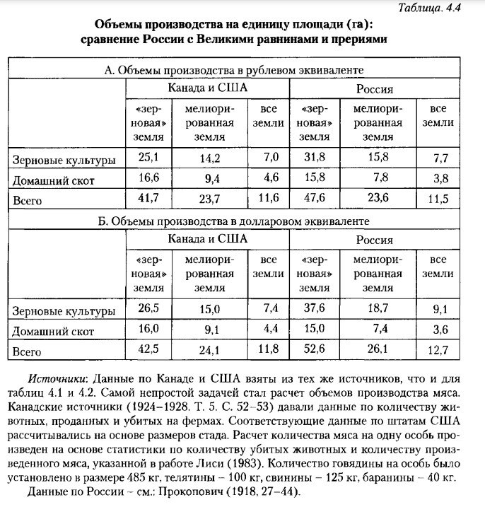 «Таблица показывает, что объёмы производства с каждого гектара в России и в Северной Америке примерно совпадали, но занятость на единицу площади в России в 8 раз превышала аналогичные показатели североамериканского региона. Следовательно, объём производства на каждого работника в России был в 8 раз ниже, чем на Великих равнинах. Недостаток российского сельского хозяйства заключался не в биологических факторах, а в организационных и технологических аспектах».
