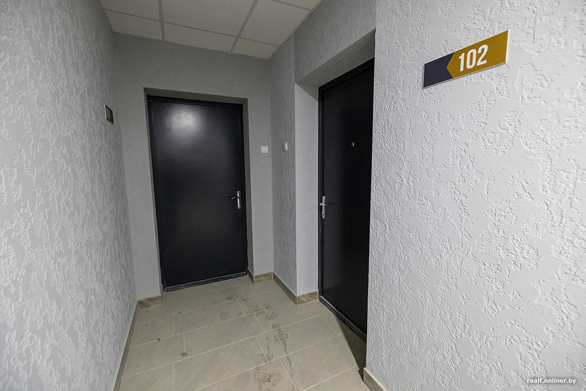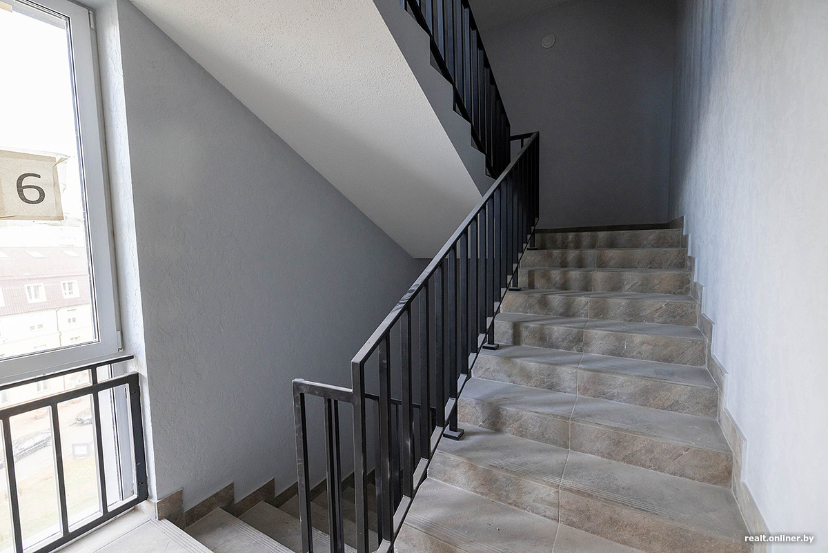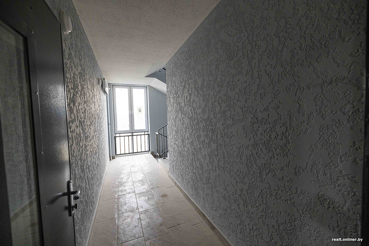 На этажах — классическая отделка: серая штукатурка на стенах, плитка на полу, металлические двери в каждую квартиру.