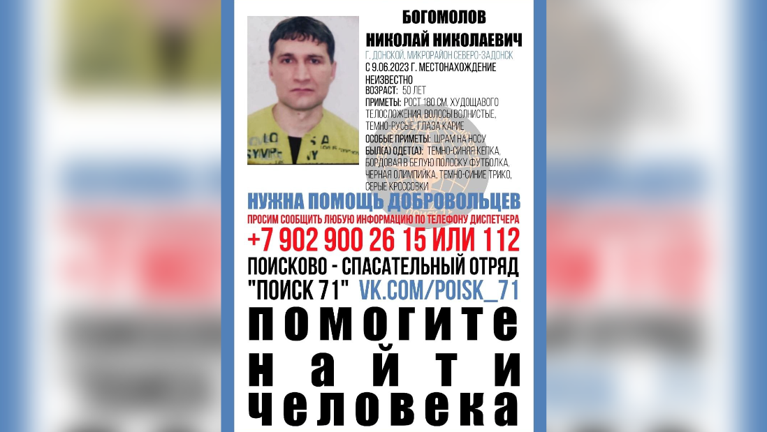 В городе Донском микрорайоне Северо-Задонск, уже более недели разыскивается местный житель Богомолов Николай Николаевич, который пропал без вести 9 июня 2023 года. Его местонахождение до сих пор неизвестно.