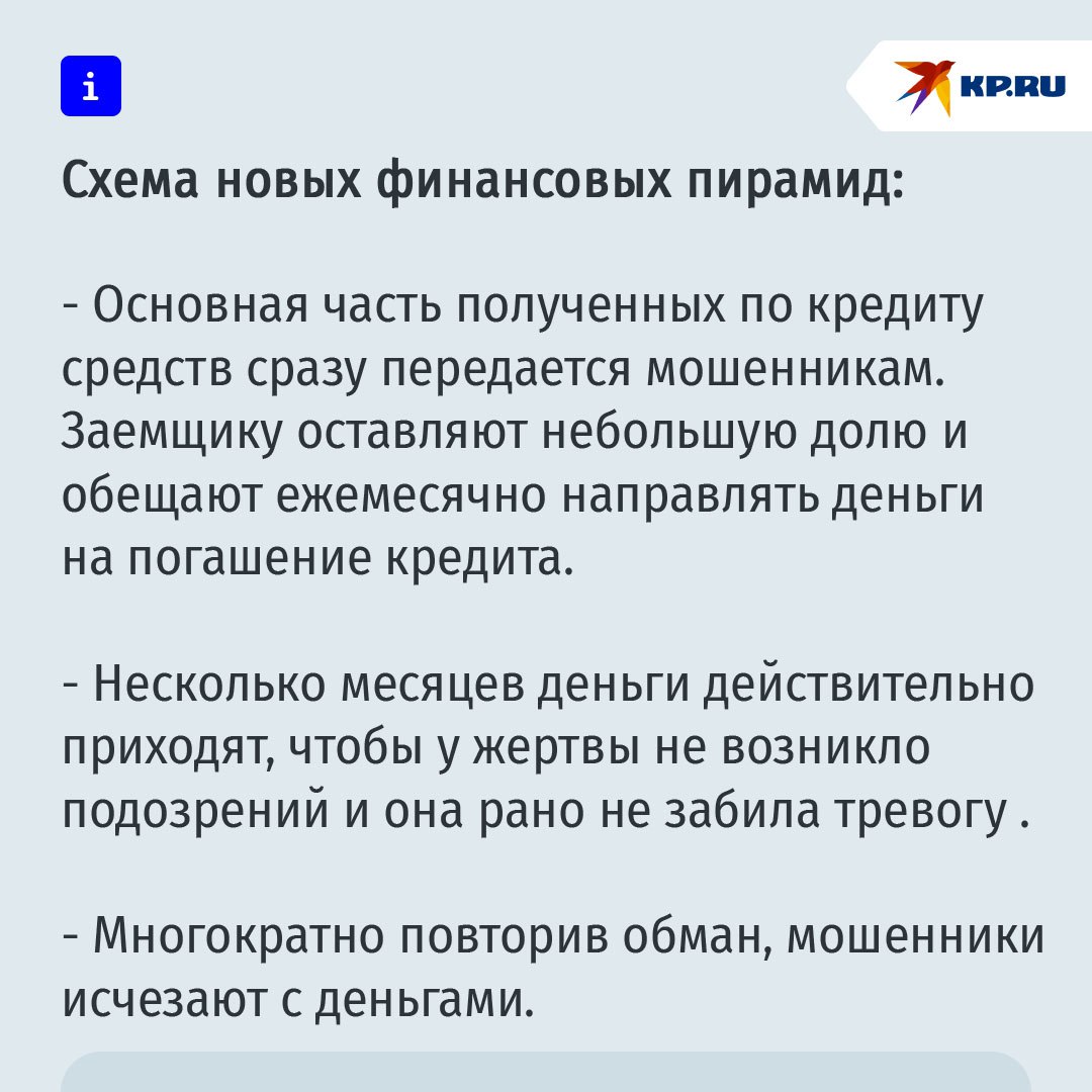 В стране снова стали появляться финансовые пирамиды, от которых уже пострадали 2,3 тысячи человек. Об этом заявил зампред правления крупнейшего банка страны Станислав Кузнецов. Но если раньше мошенники старались заманить в них граждан, обещая необоснованно высокие доходы, то сейчас людям предлагают оформить на себя кредит. Суть обмана в том, что жертва берет кредит на свое имя за вознаграждение. Подробности схемы аферистов - на карточке ⤴️